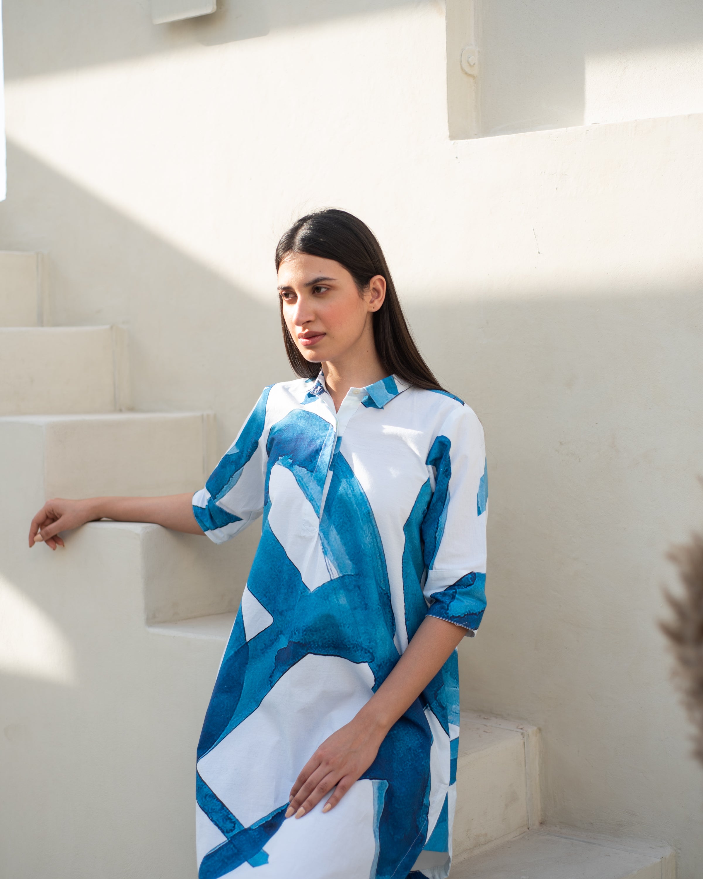 Indulge in the luxurious comfort and sophistication of the Amelie Shirt Tunic Dress, handcrafted from soft cottons and featuring a stunning Brush stroke indigo print. This elegant piece boasts a round hem and a fresh, summer-inspired design, perfect for all-day wear..