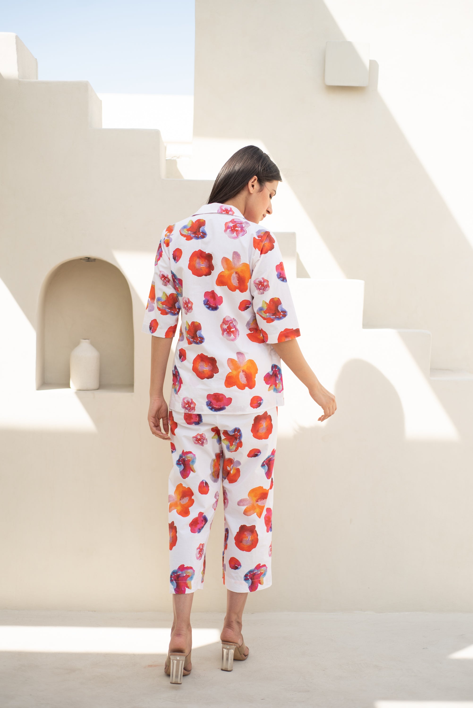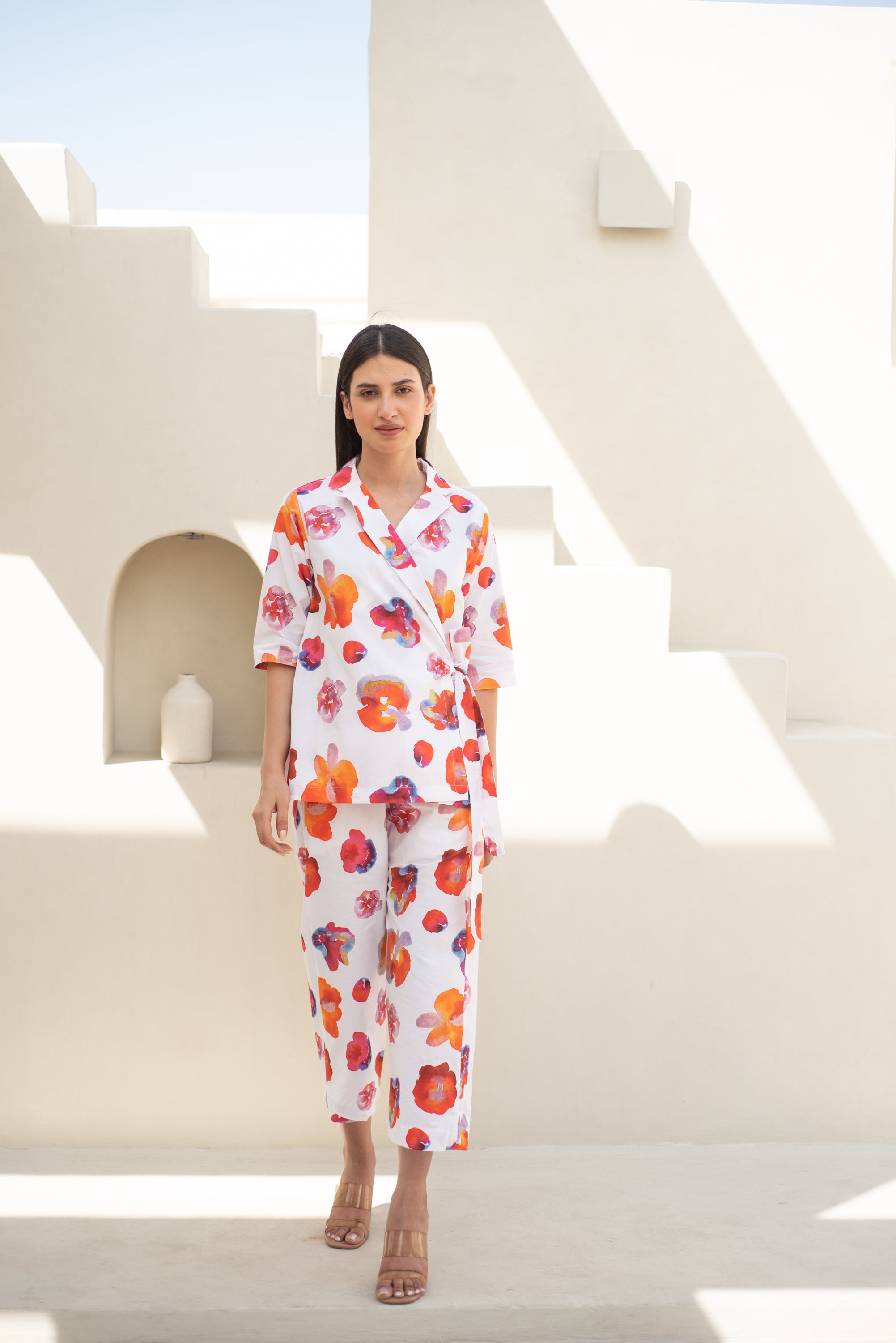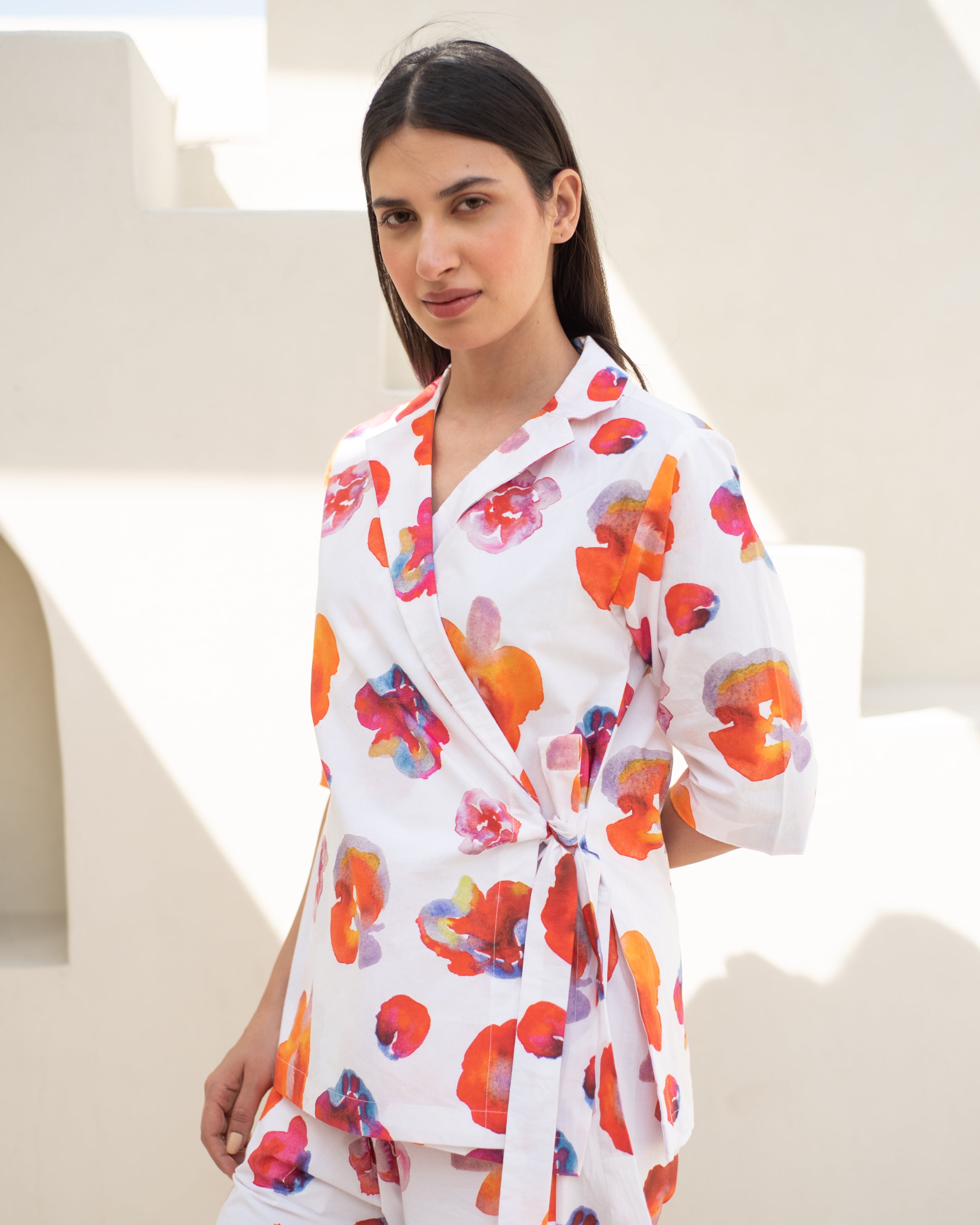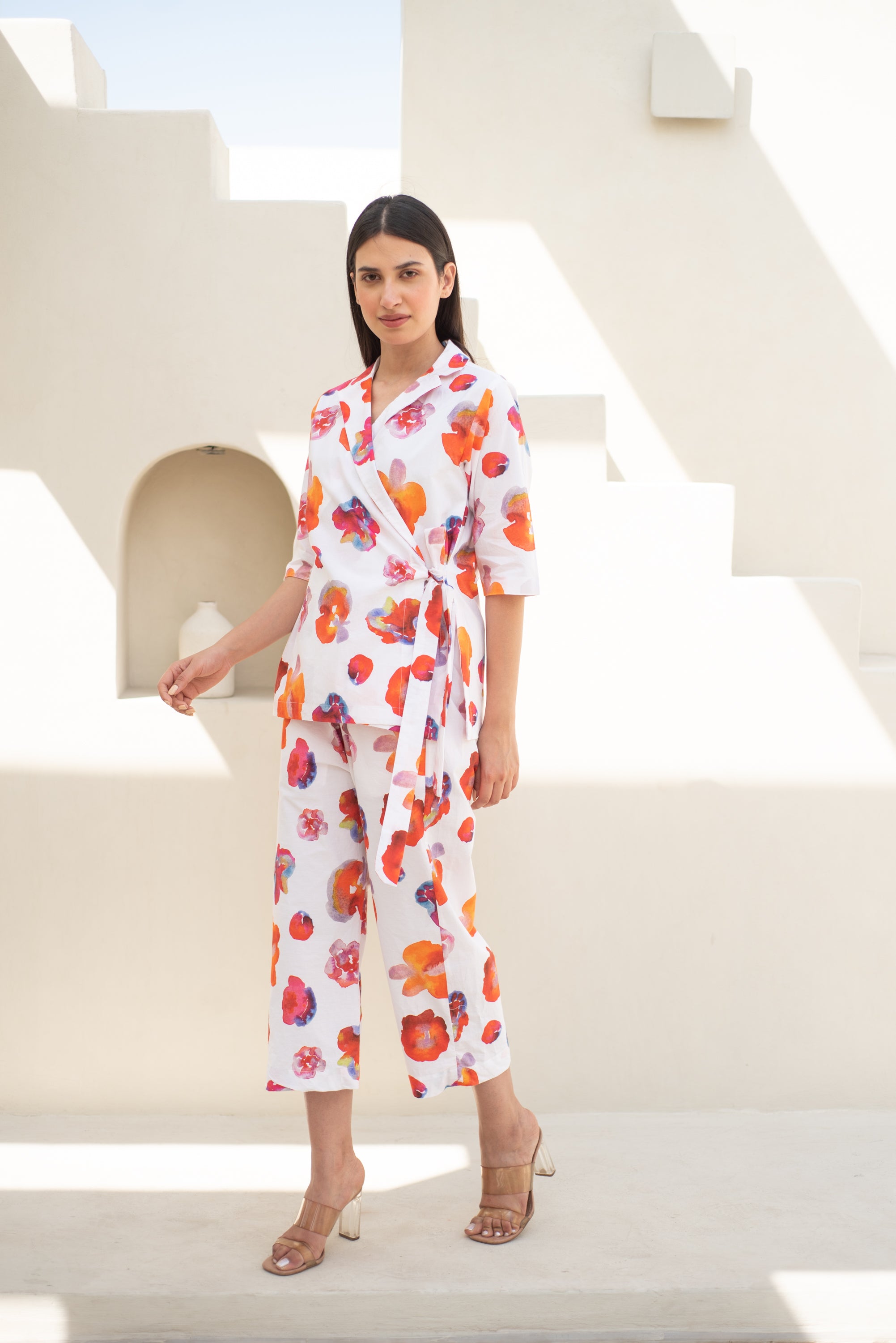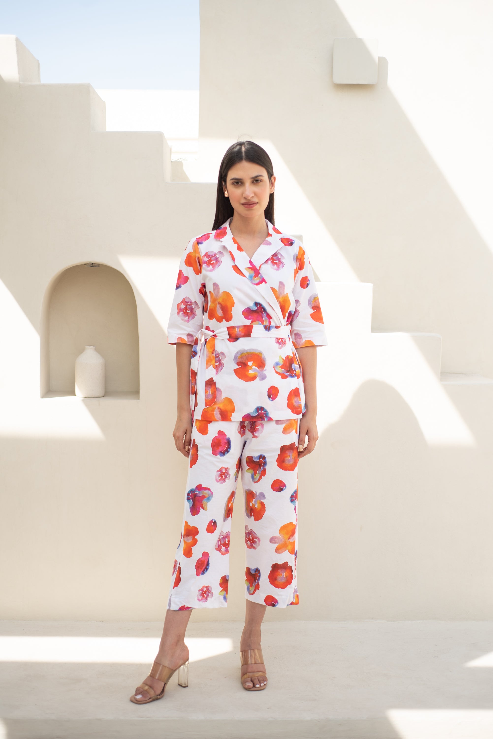 Experience the perfect blend of modern style and sophistication with our Petra Suit Set. This luxurious jacket and pant features a Bright Floral print on soft cottons Inspired by Abstract watercolour Art, creating a comfortable and stylish outfit for both formal and casual occasions. The structured waist belt allows you to customize your look, giving you a tailored and exclusive appearance. Elevate your wardrobe with this must-have ensemble.