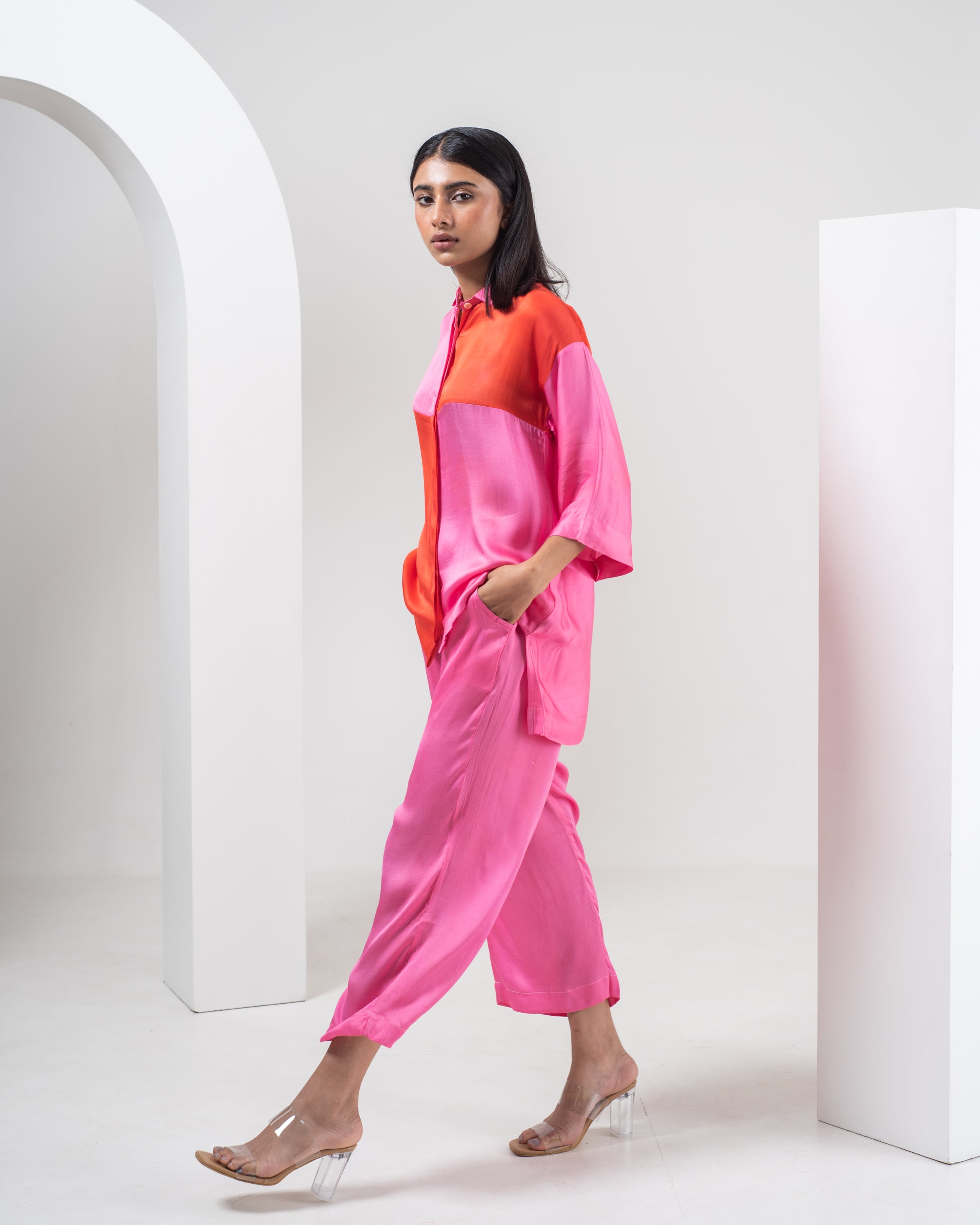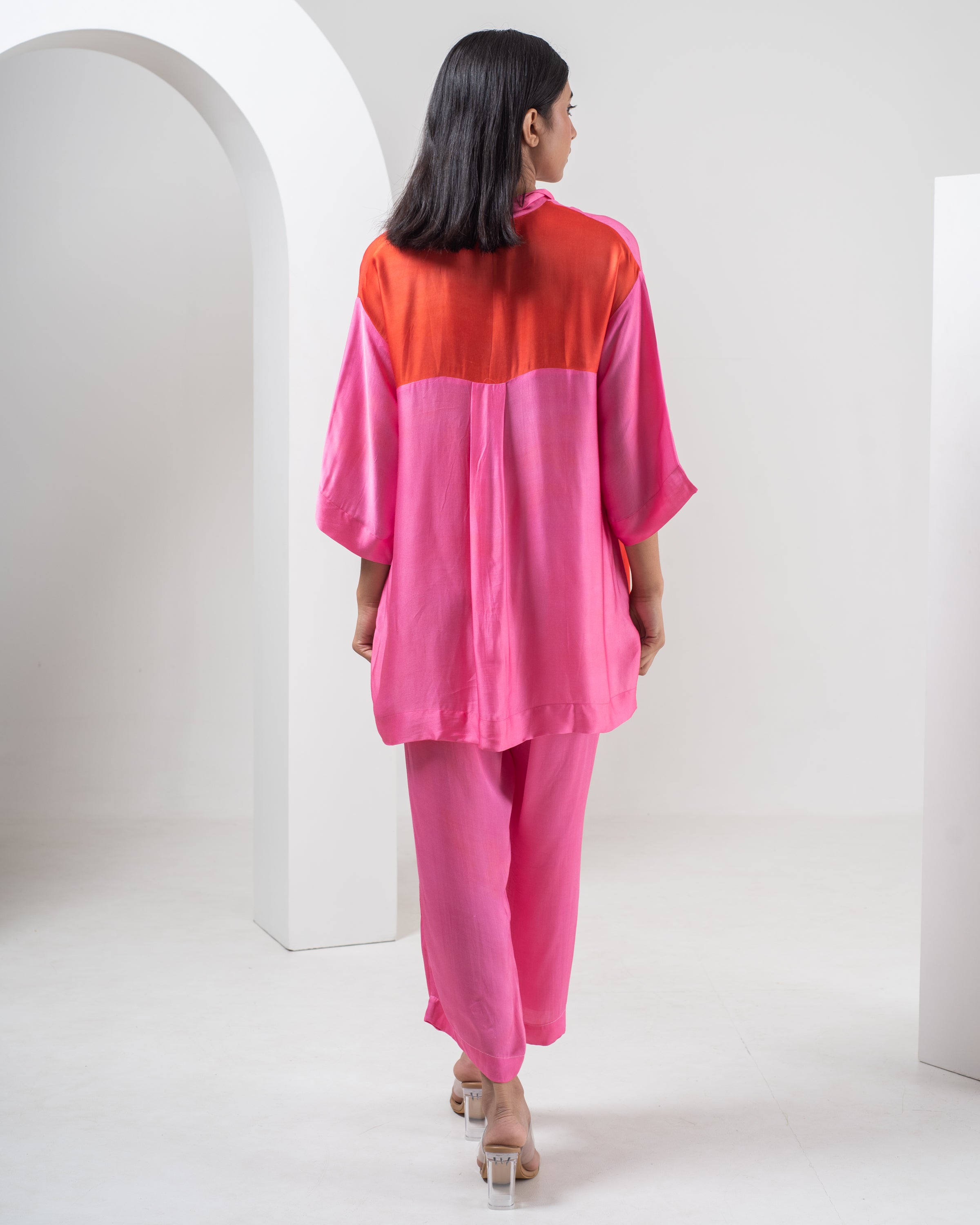 Indulge in luxury with our Alula Shirt and pant Set. This stunning set features a unique Geometrical Grid design in elegant Pink and Red. Paired with matching Pants, both made with soft, plant-based silk in a lustrous finish. Elevate your wardrobe with timeless sheen and style. This versatile piece is a must-have for anyone looking to add a pop of color to their wardrobe.