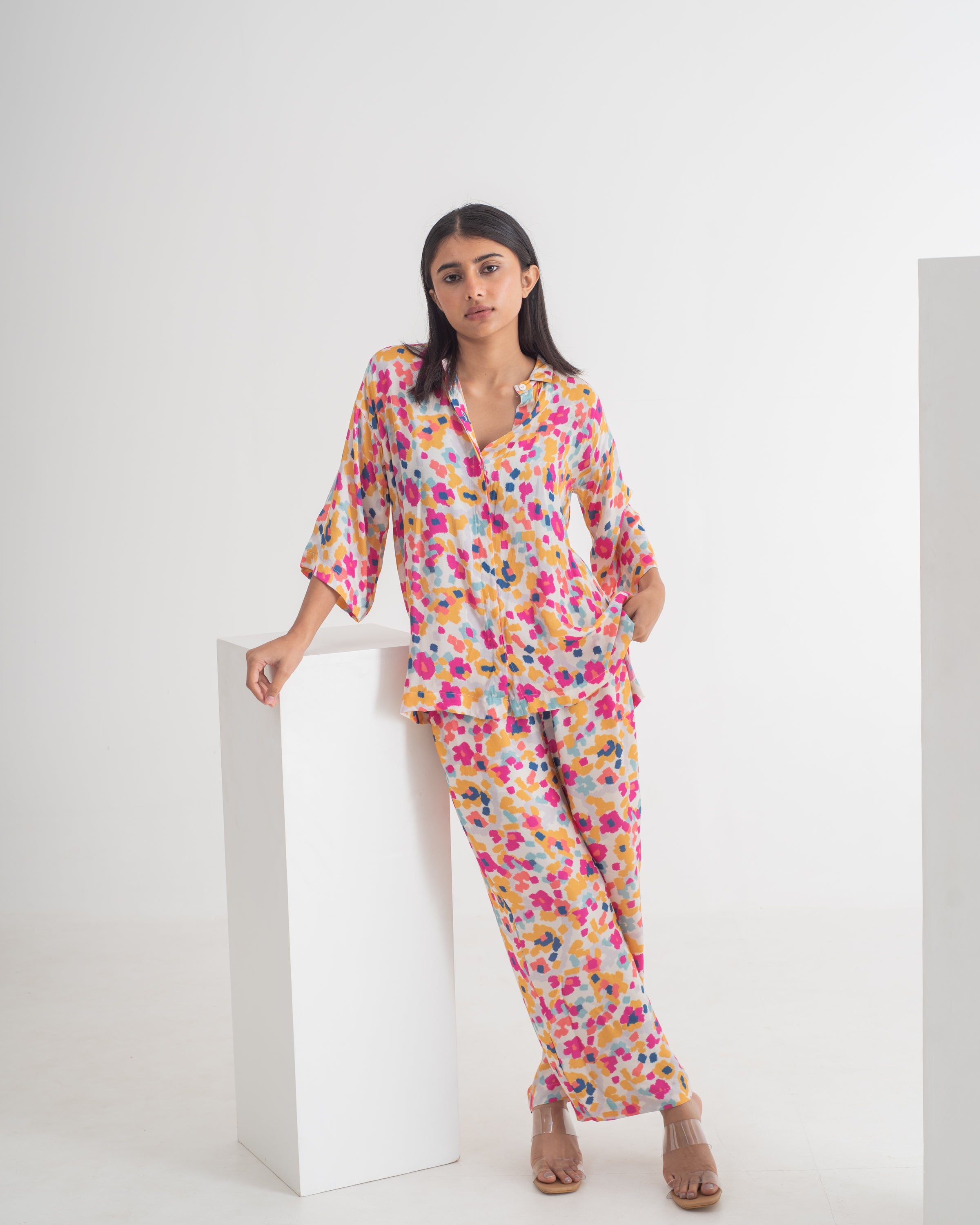 Indulge in luxury with the Brasov Drop shoulder shirt and pant Set. Featuring a vibrant multiolour print and striking geometric patterns, this playful co-ord set will elevate your style for any occasion. With a modern and chic design, this outfit will make you stand out in a crowd. Feel sophisticated and exclusive in the Brasov Set. This versatile piece is a must-have for anyone looking to add a pop of color to their wardrobe.