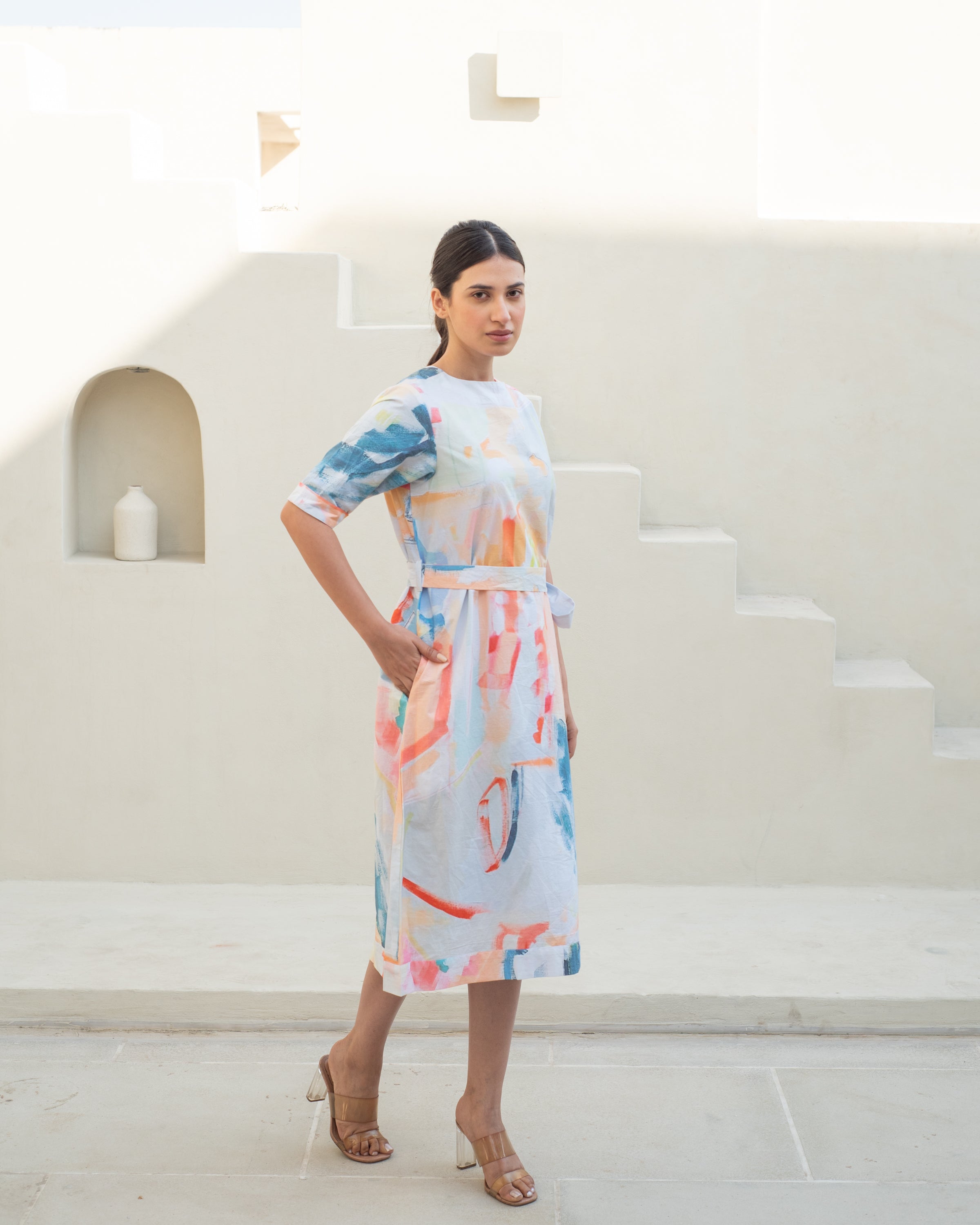 Introducing the stunning Saville Dress, handcrafted with comfortable cotton and adorned with colourful prints inspired by Modern art. A minimal silhouette featuring a waist belt, makes it the perfect Summer dress for any occasion. Elevate your summer wardrobe with this exclusive piece.