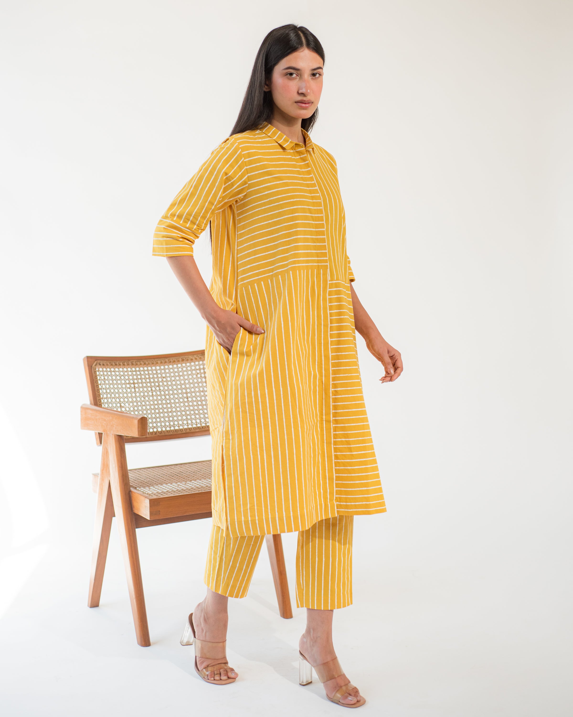 Elevate your summer style with our Cotton Hand-blocked Printed Tunic and Pants set in Yellow Colour. Made from premium cotton fabric, hand-blocked printed with intricate linear designs, this set is a perfect blend of comfort and style.
