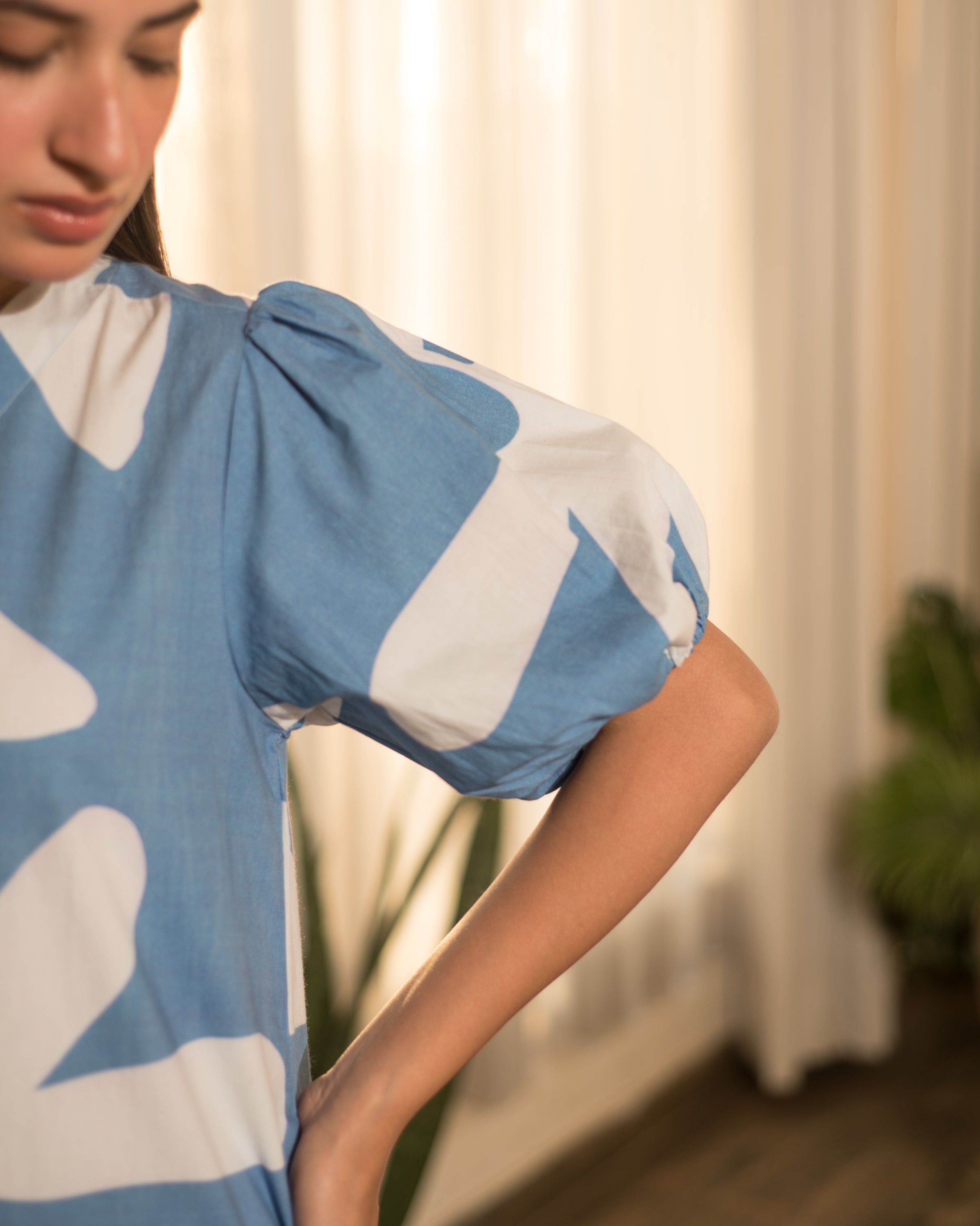 Powder Blue Floral Print V neck dress. It features elasticated sleeves.