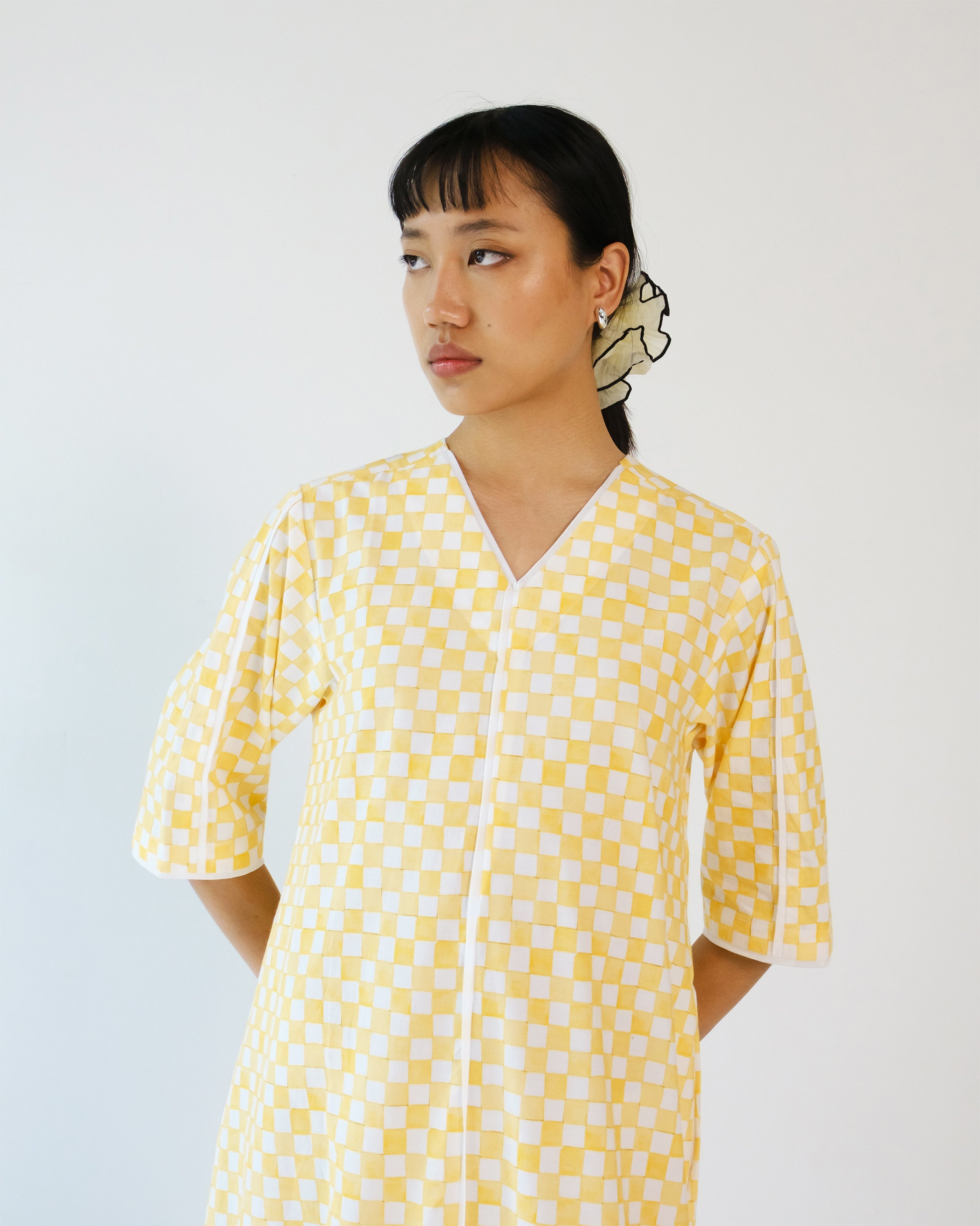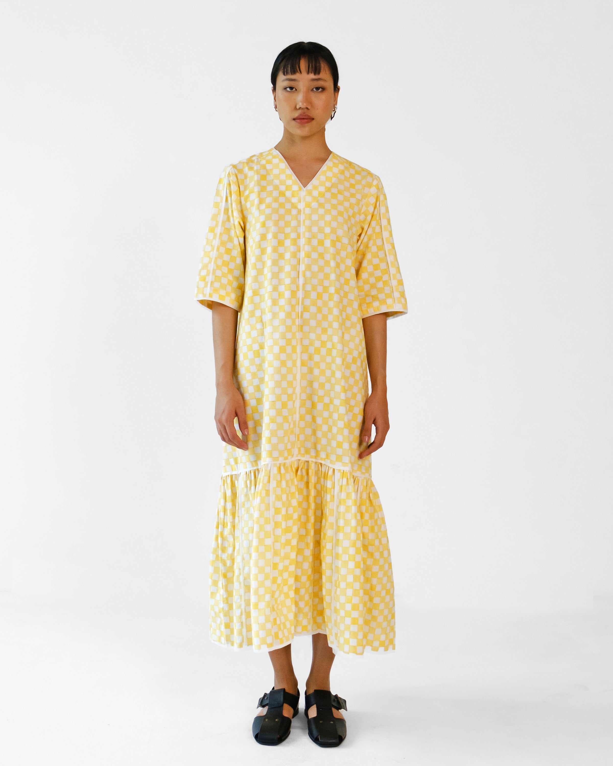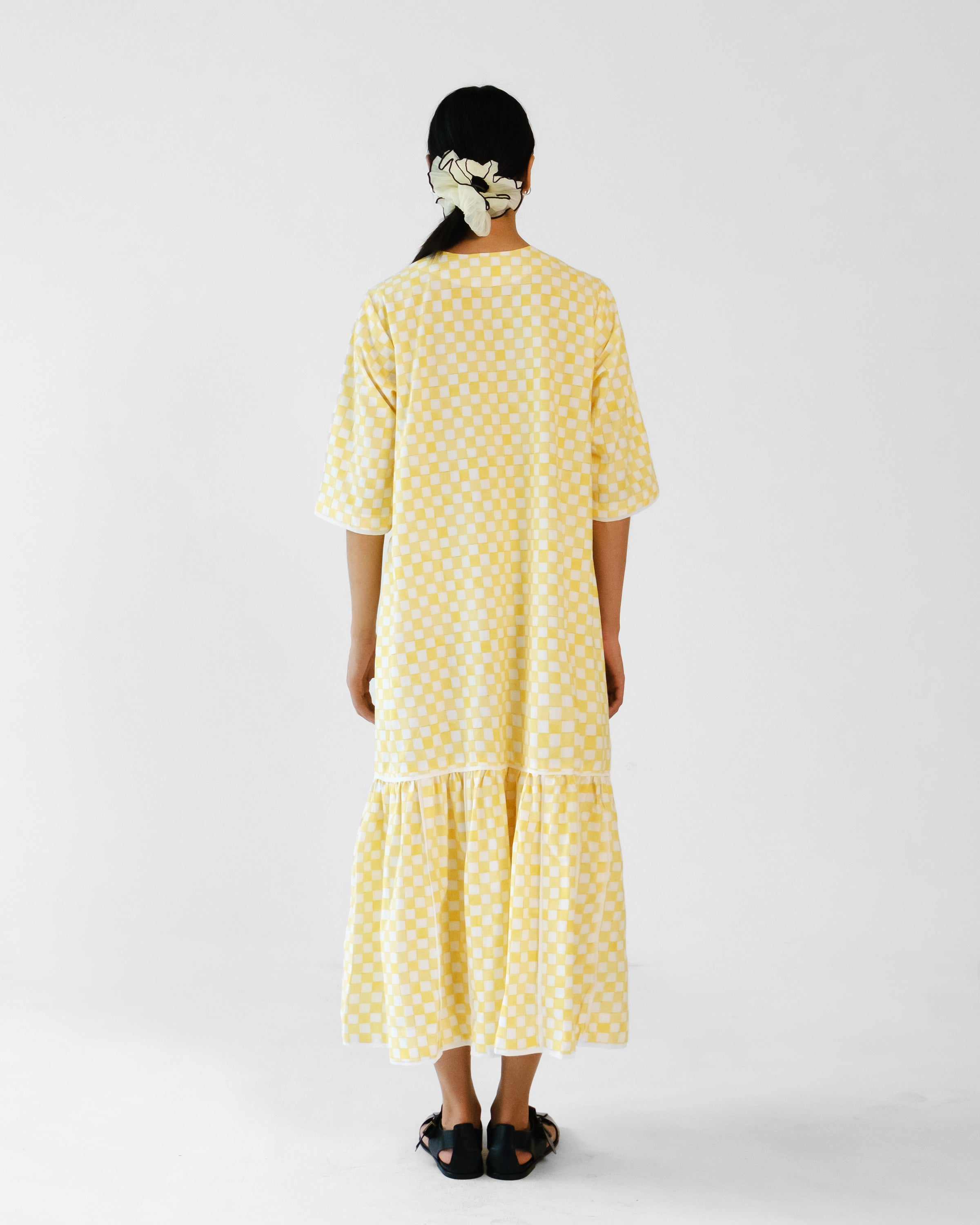 A versatile and elegant addition to your wardrobe. Featuring a stunning watercolour checkered print with applique details, this dress offers a comfortable and easy silhouette perfect for any occasion. Made with luxurious cotton materials, it's the perfect blend of style and comfort. Elevate your look with this sophisticated and exclusive dress.
