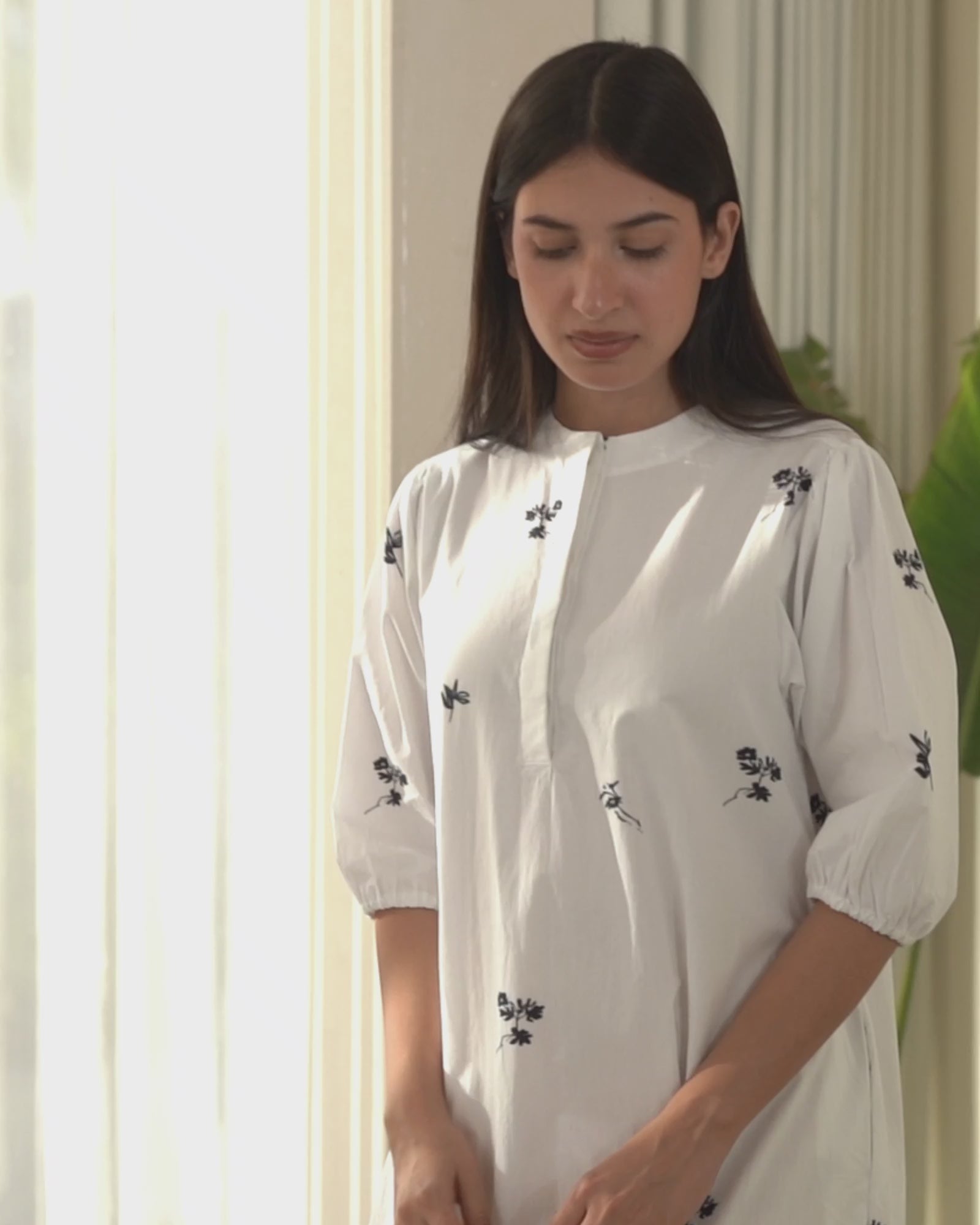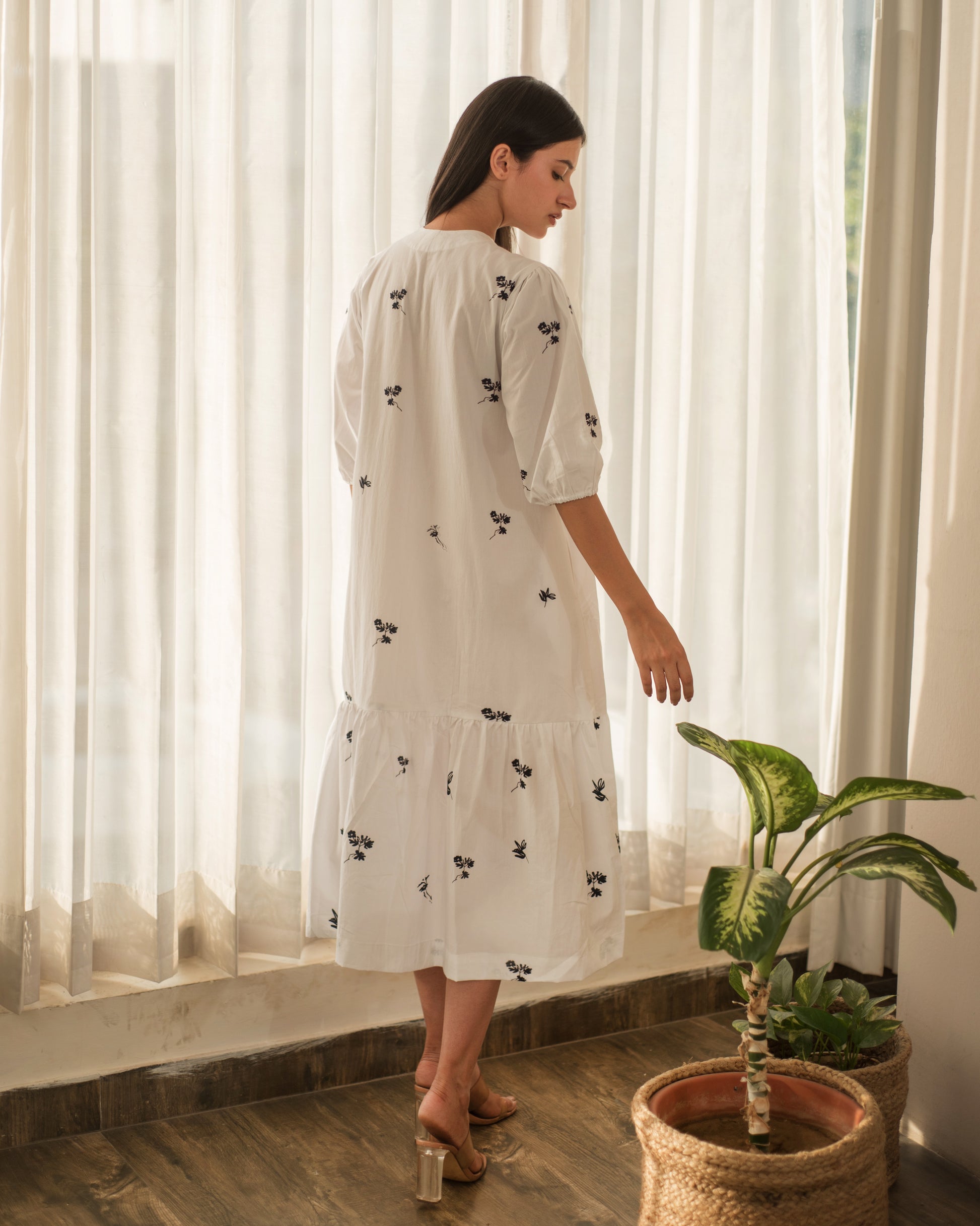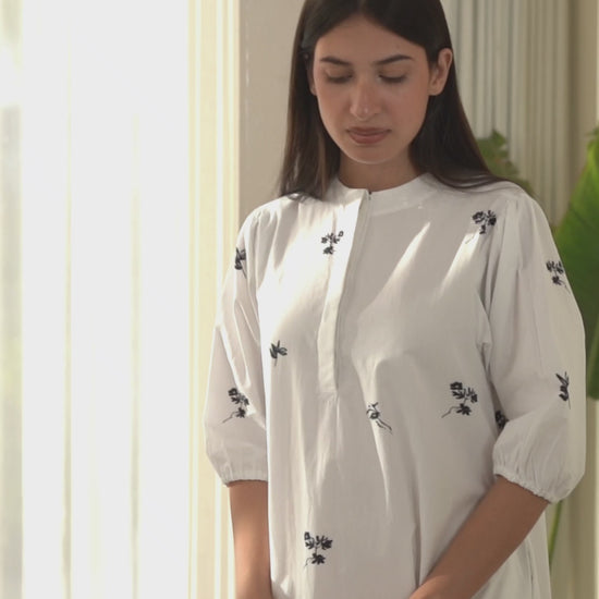 A pristine white dress, with small floral prints and elasticated sleeves. It is perfectly suited for all your day outs and get aways. The dress is crafted in cotton poplin, and does not require any slip/lining inside.