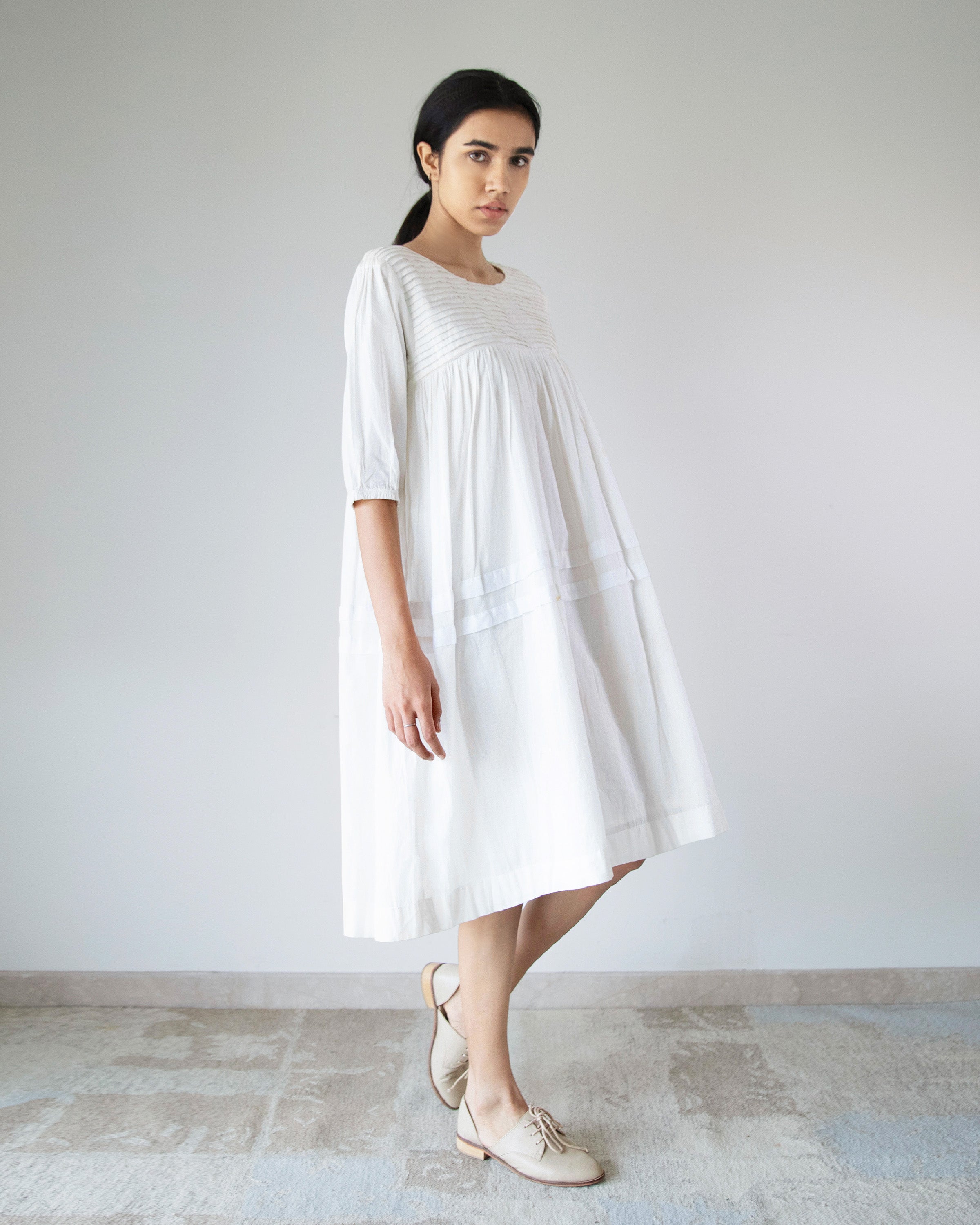 The dress features pin tucks on front and back yoke, which makes the whole design exclusive. It features two large pleats on the body to add more charm. The dress comes with a soft lining inside, and is crafted in pure cotton fabric. It also features elasticated sleeve detail. Shop this gorgeous piece now!