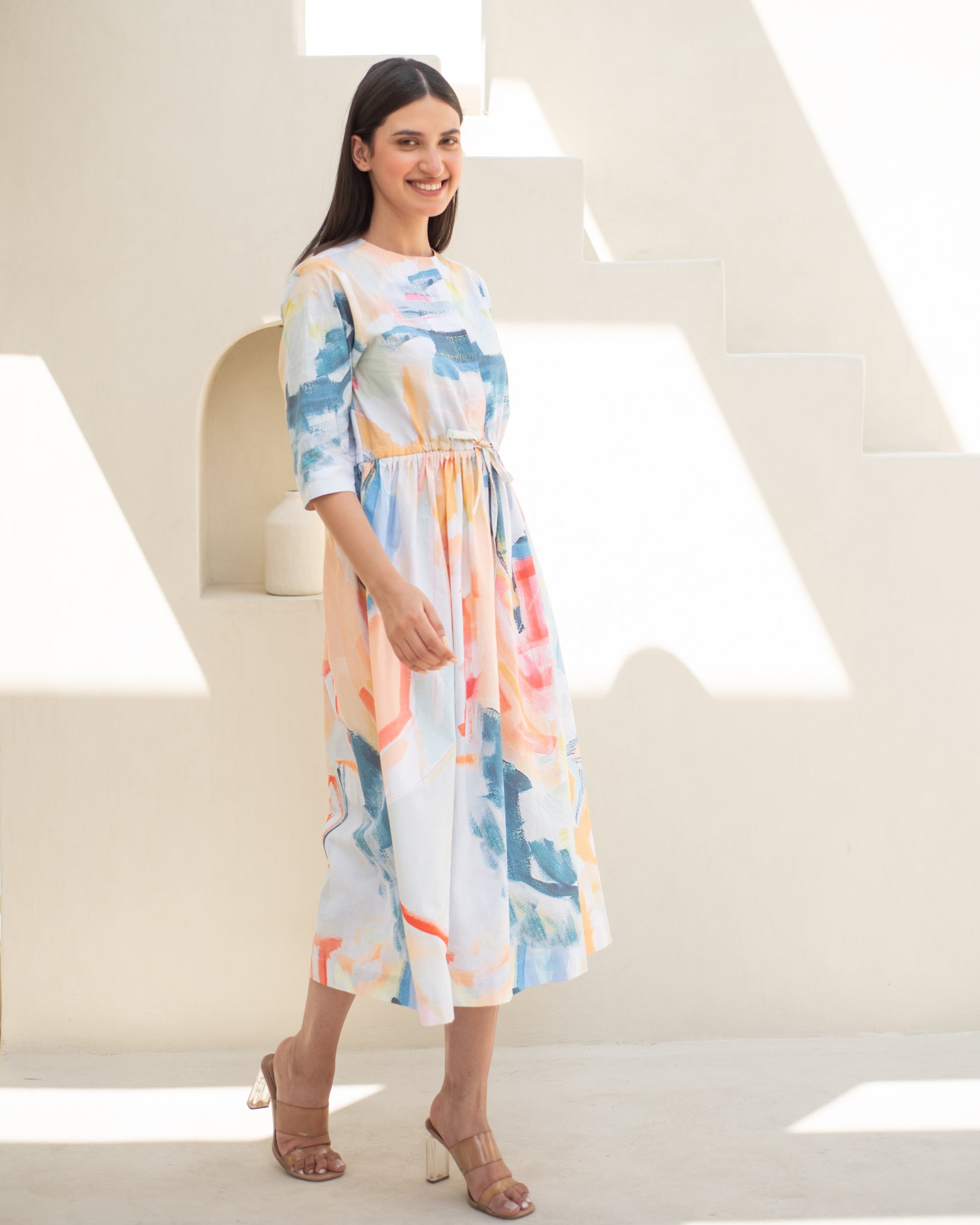Indulge in pure elegance with the Zenia Dress. Made of premium cotton, this versatile dress features subtle prints and drawstring details on the waist for a flattering fit. Crafted with comfortable cottons, this dress is perfect for any occasion. Elevate your wardrobe with the Zenia Dress.