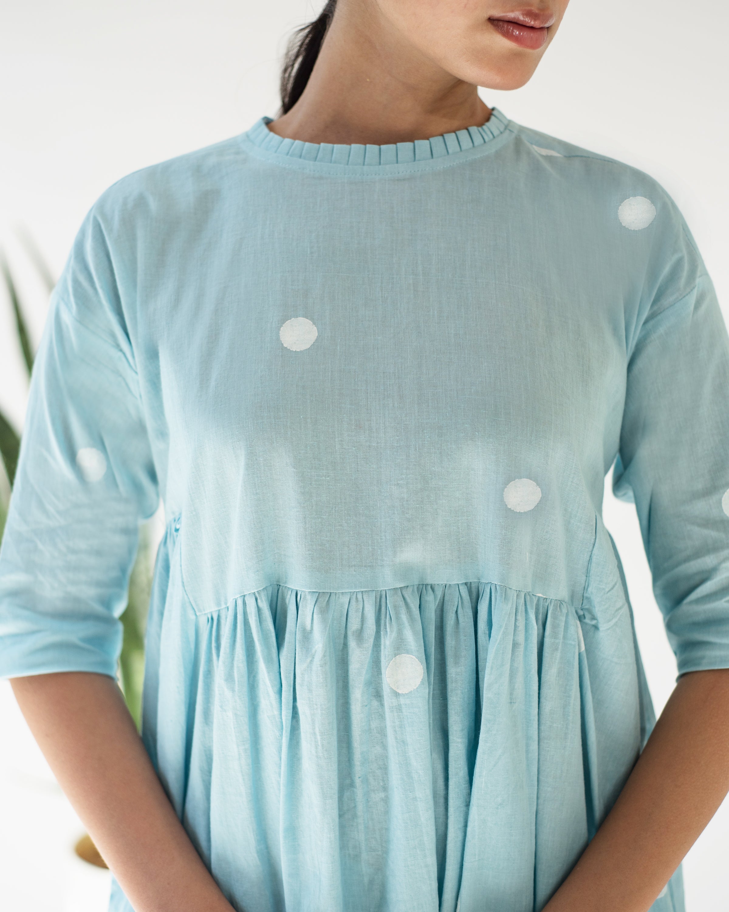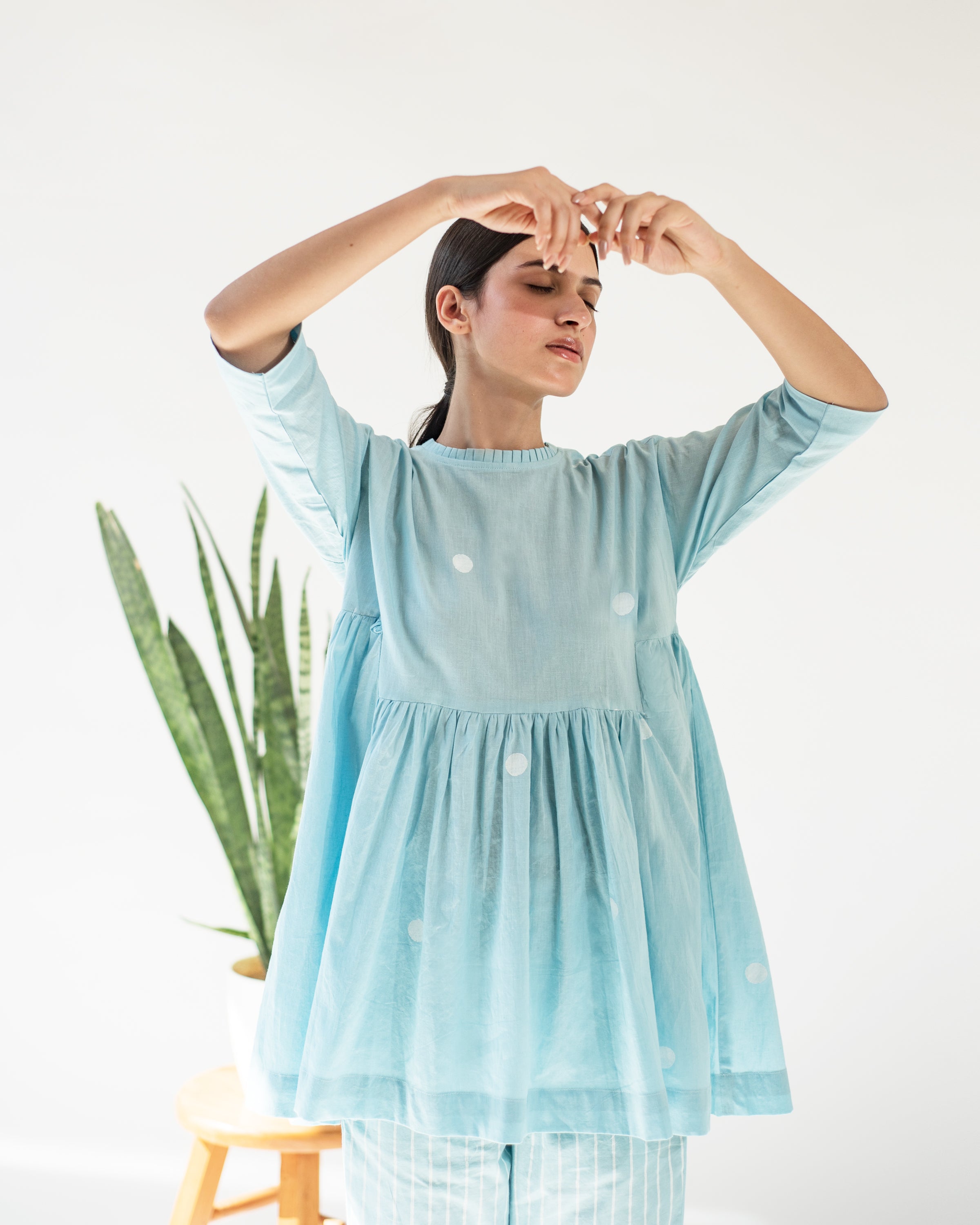 The Powder Blue Polka Top features drop shoulder detail with Pleated Neck, and is crafted in pure cotton with Grey Polkas Minimally Placed all over. Wear it to work or wear it to a corner cafe with our Blue Striped pants, it completes the look perfectly. *Pants are sold separately.
