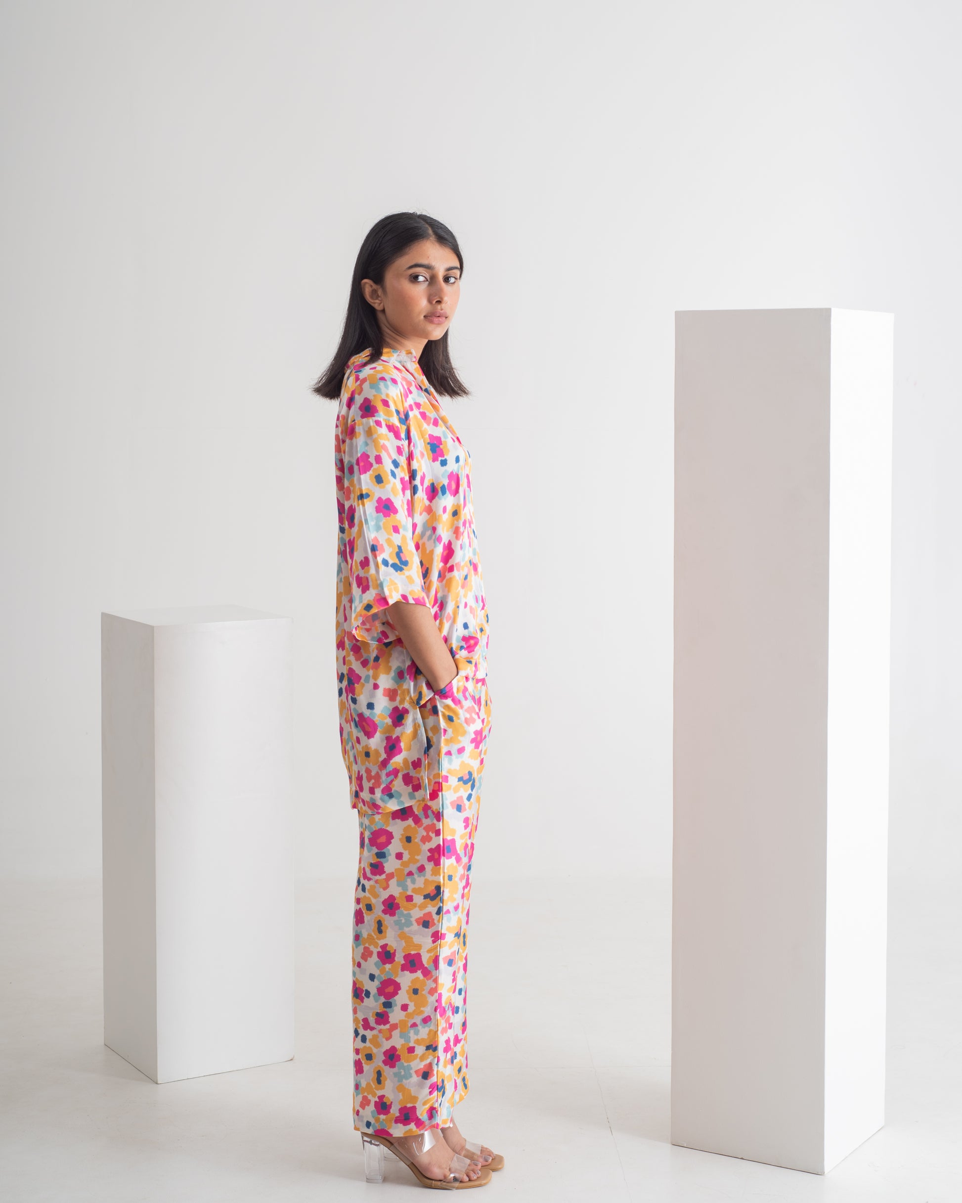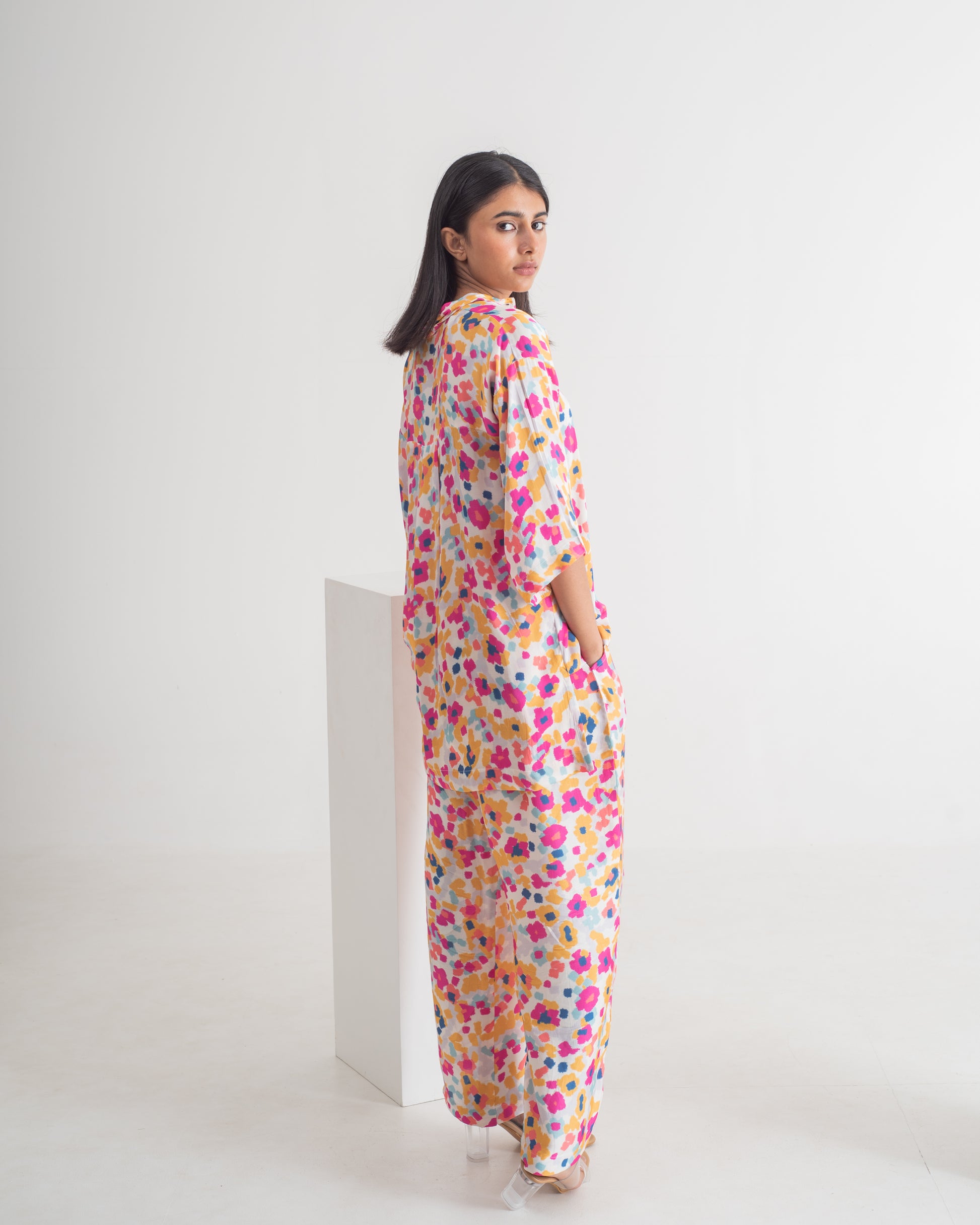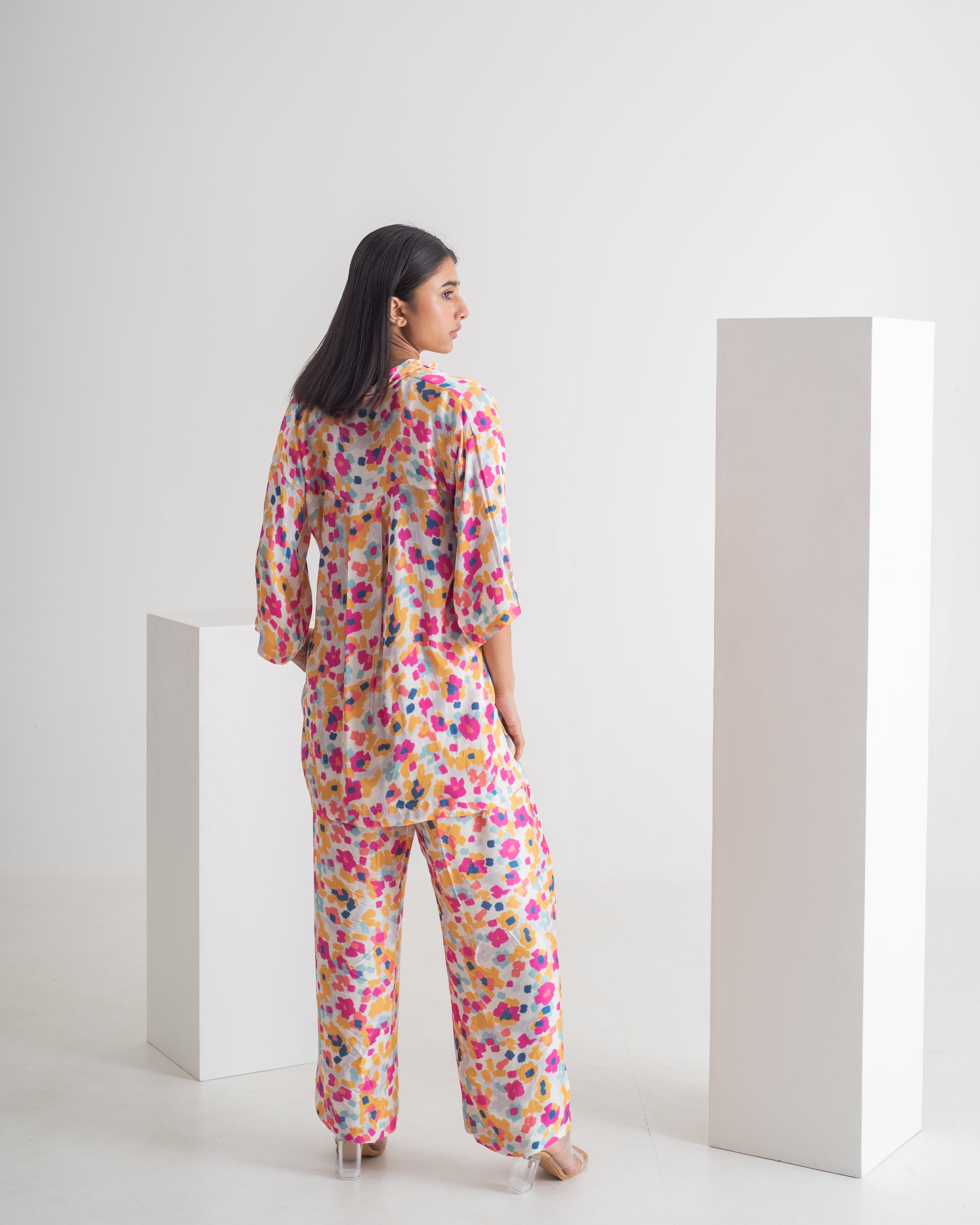 Indulge in luxury with the Brasov Drop shoulder shirt and pant Set. Featuring a vibrant multiolour print and striking geometric patterns, this playful co-ord set will elevate your style for any occasion. With a modern and chic design, this outfit will make you stand out in a crowd. Feel sophisticated and exclusive in the Brasov Set. This versatile piece is a must-have for anyone looking to add a pop of color to their wardrobe.