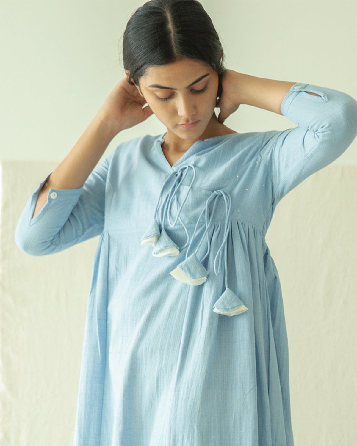 Powder Blue is the colour of the season. Have a look at this exclusive Tunic, crafted in handwoven cotton, and beautified with minimal hand embroidery on the yoke. You can wear this as a dress or over pants. Shop this dress and get ready to bag compliments. *Pants are sold separately.