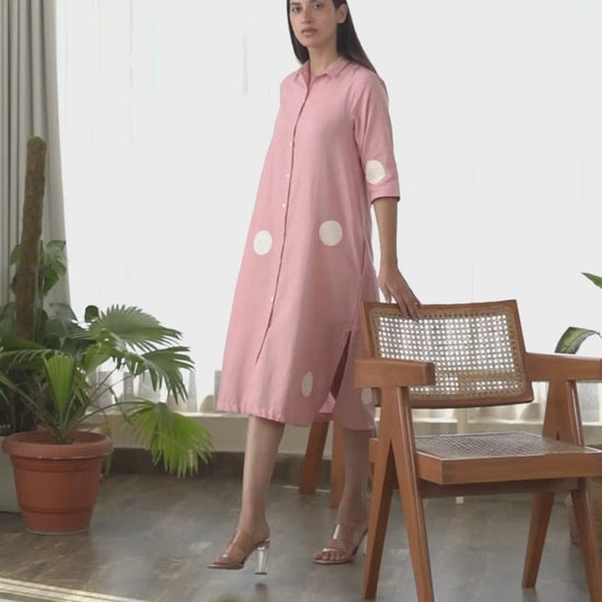 Assisi Dress in pink colour, crafted in cotton linen fabric with hand block polka dots