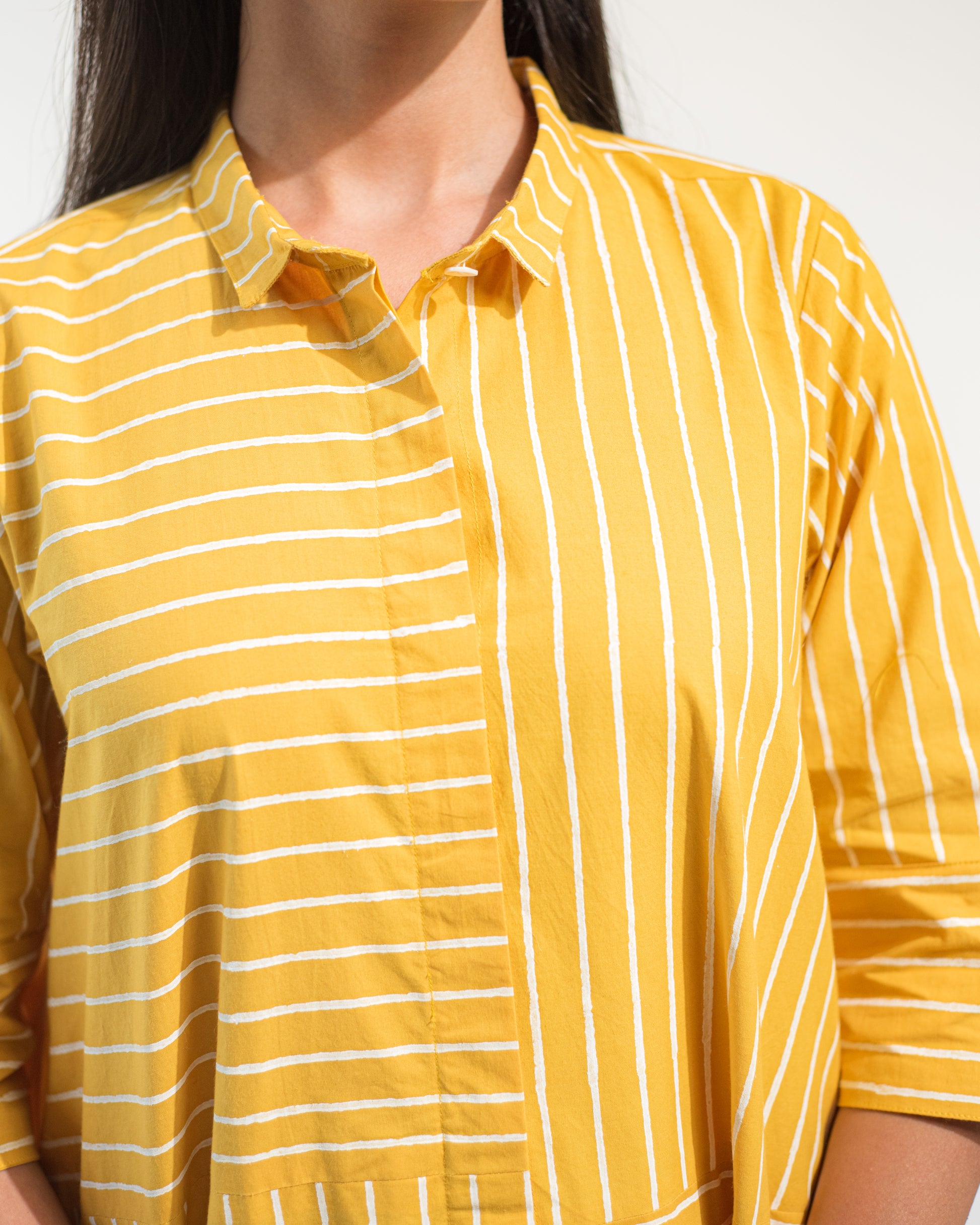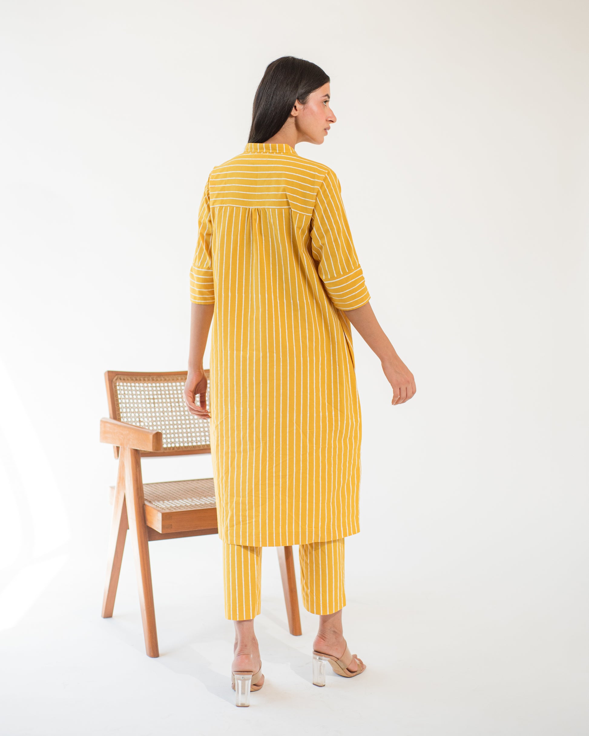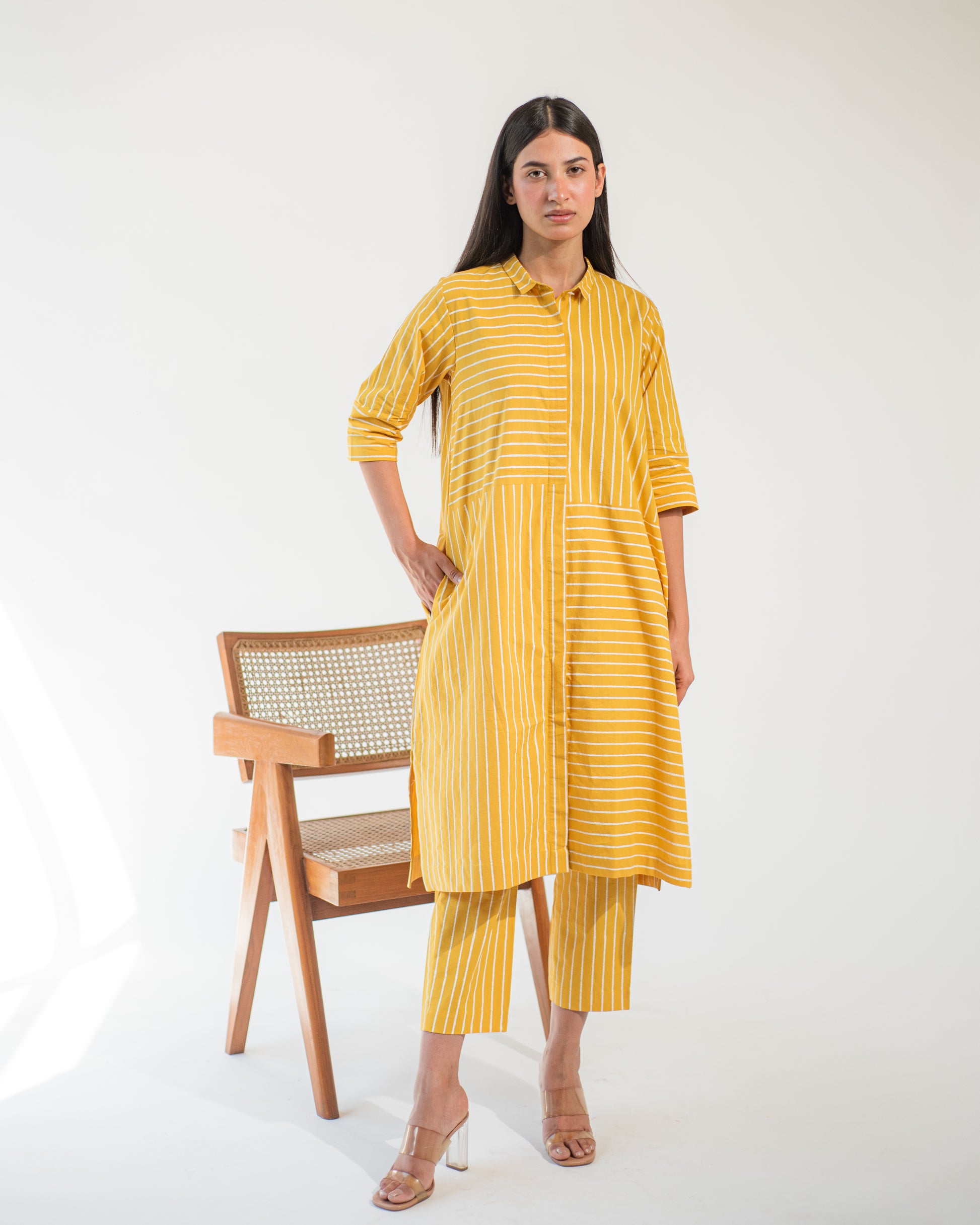 Elevate your summer style with our Cotton Hand-blocked Printed Tunic and Pants set in Yellow Colour. Made from premium cotton fabric, hand-blocked printed with intricate linear designs, this set is a perfect blend of comfort and style.