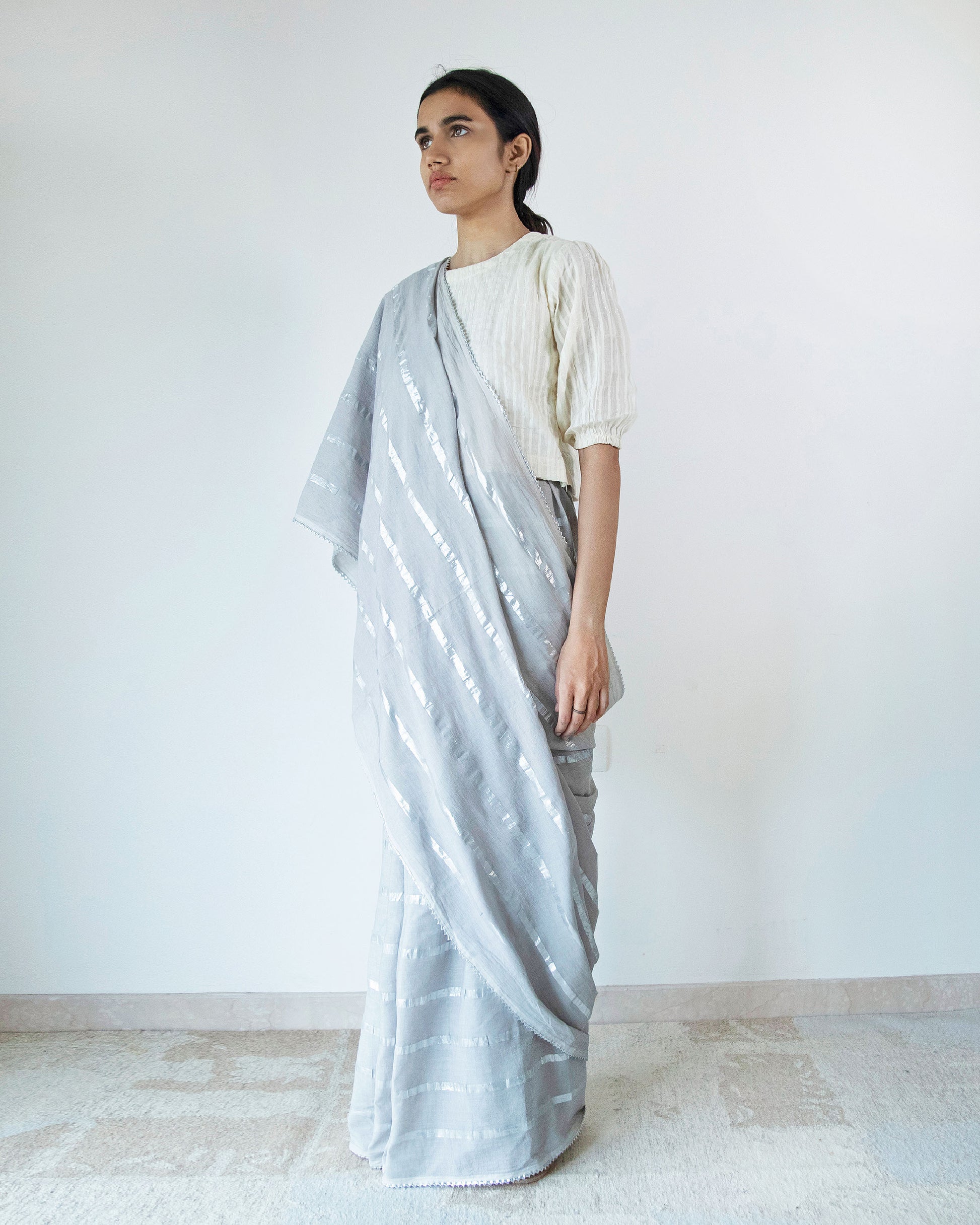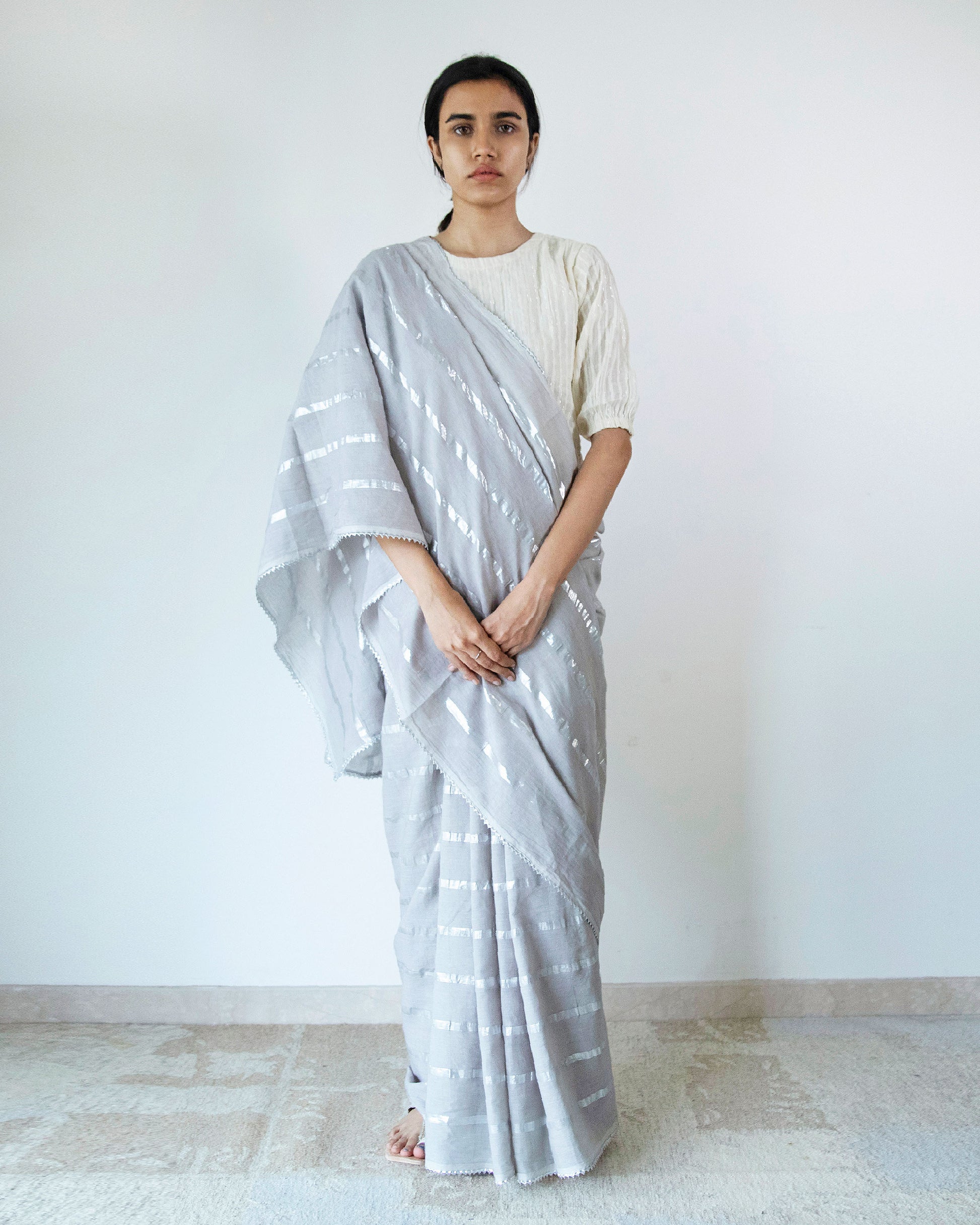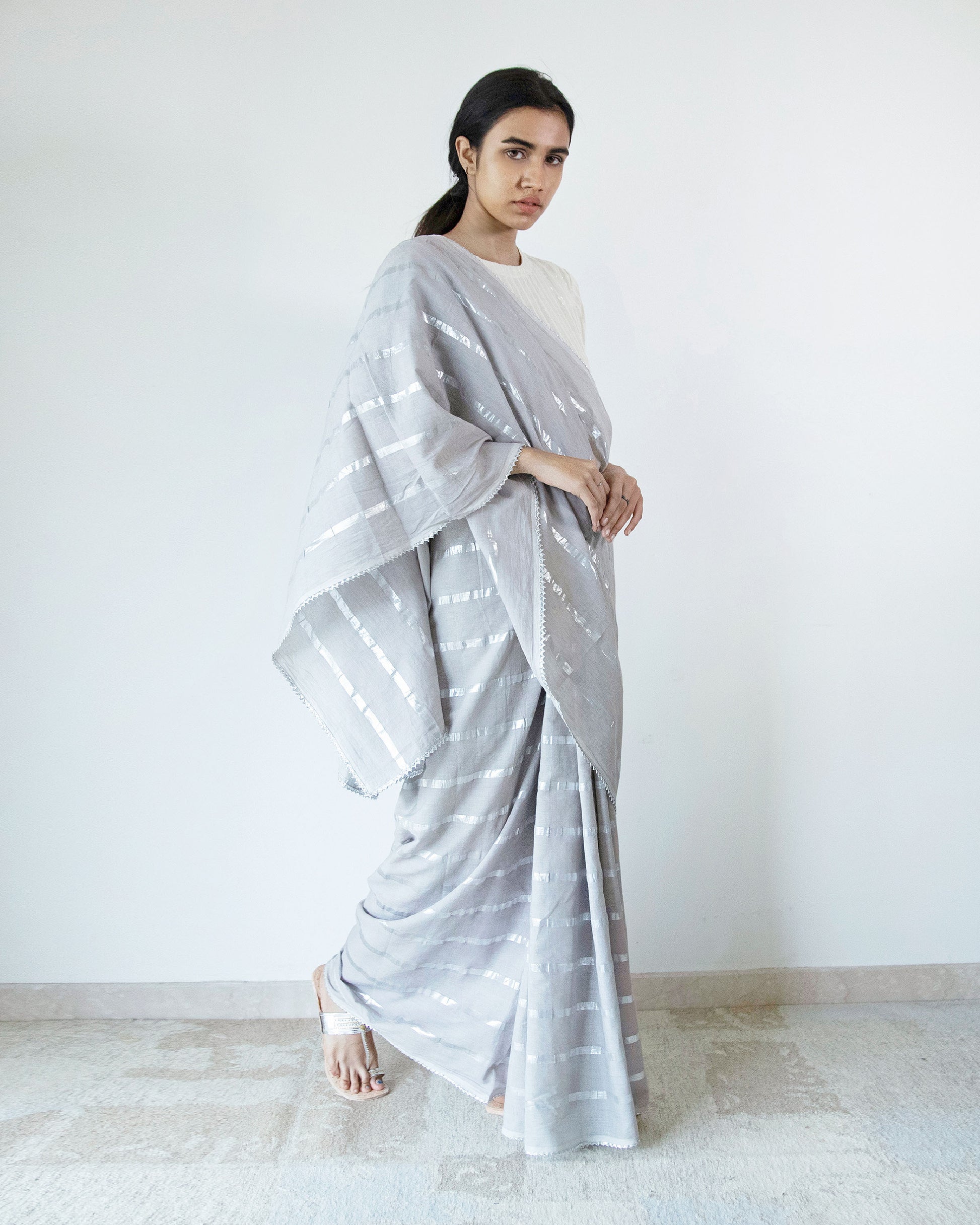 Featuring the Grey Saree in pure cotton and zari woven fabric, with stripes all over. The Saree is light weight, soft and drapes beautifully. (Note: Blouse is sold separately)