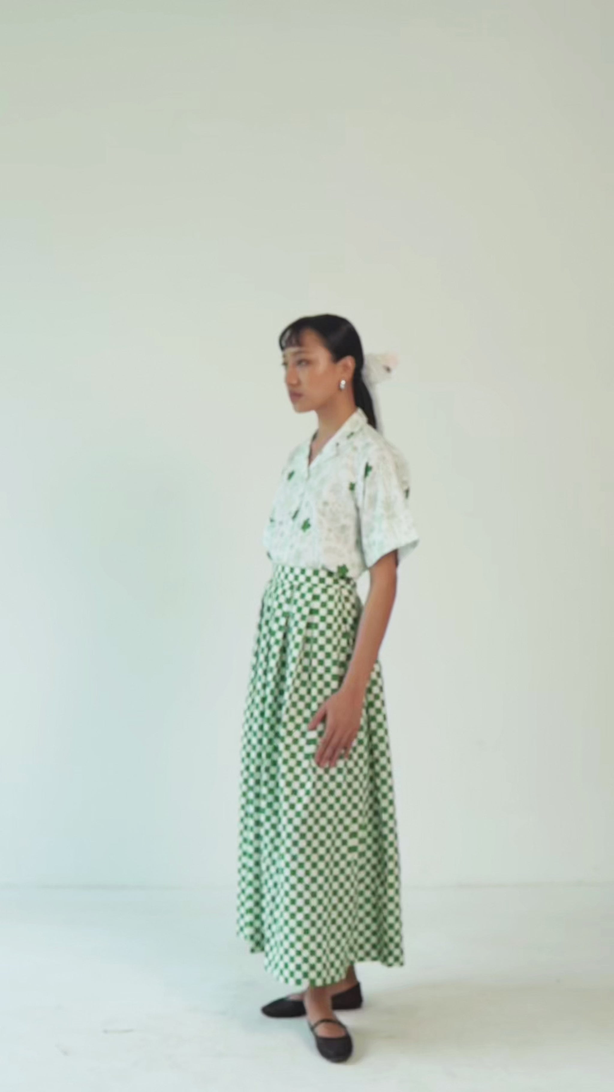 Green and white checkered skirt features elegant box pleats, while the minimal print cuban collar top adds a touch of sophistication with Green floral highlights. Perfect for adding a twist to your ensemble.