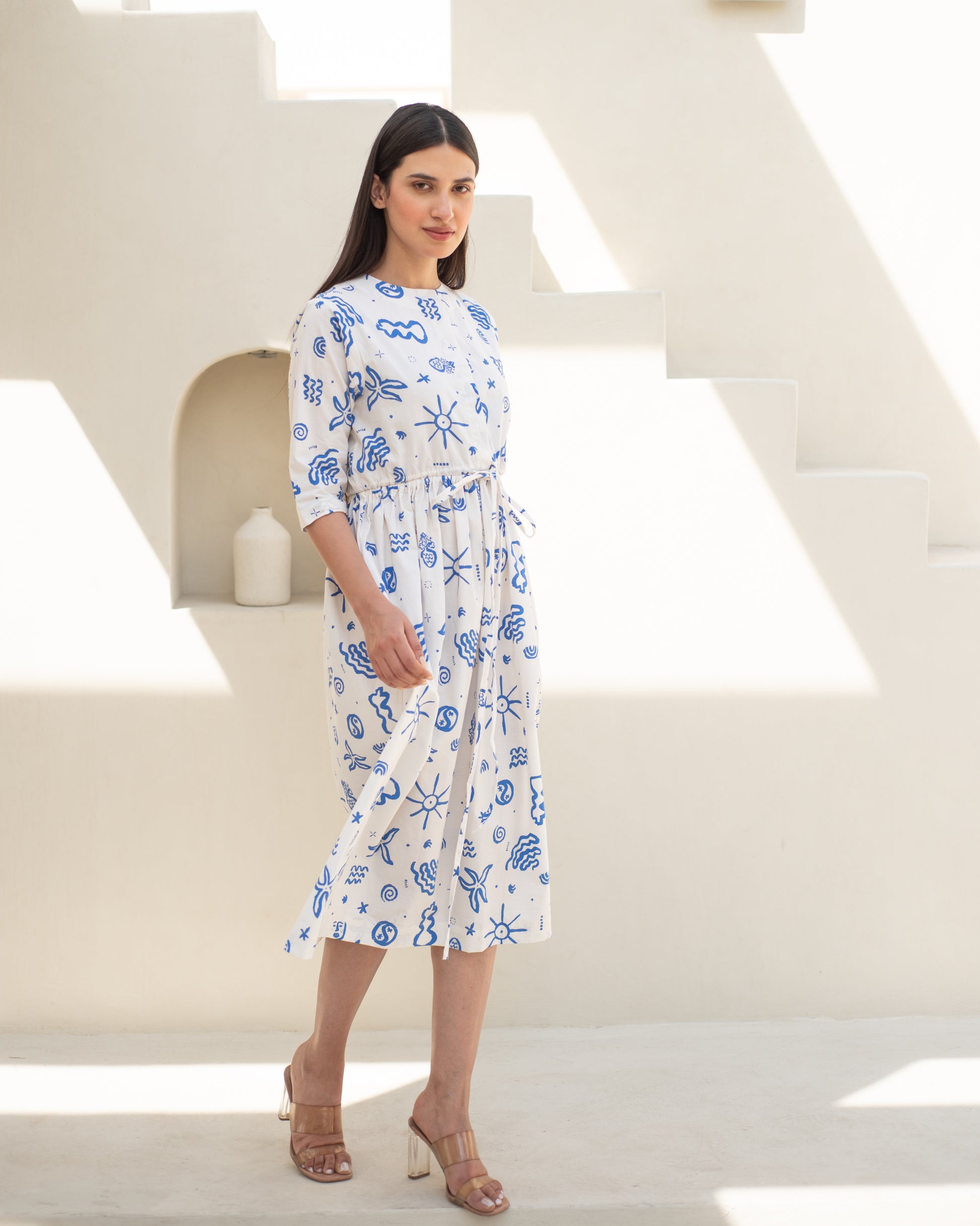 Indulge in pure elegance with the Aida Dress. Made with premium cotton, this versatile dress features subtle prints and drawstring details on the waist for a flattering fit. Crafted with comfortable cottons, this dress is perfect for any occasion. Elevate your wardrobe with this beautiful piece.