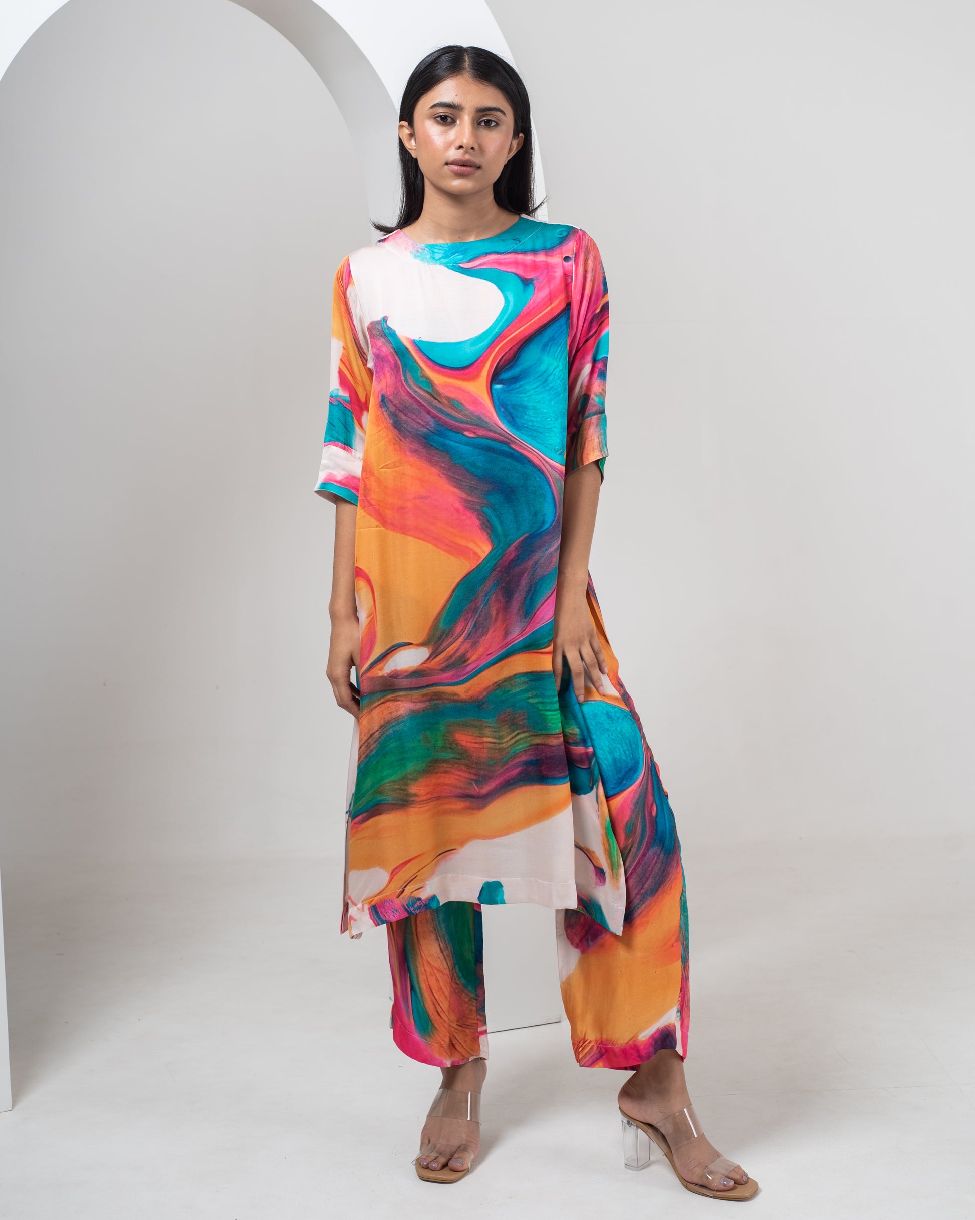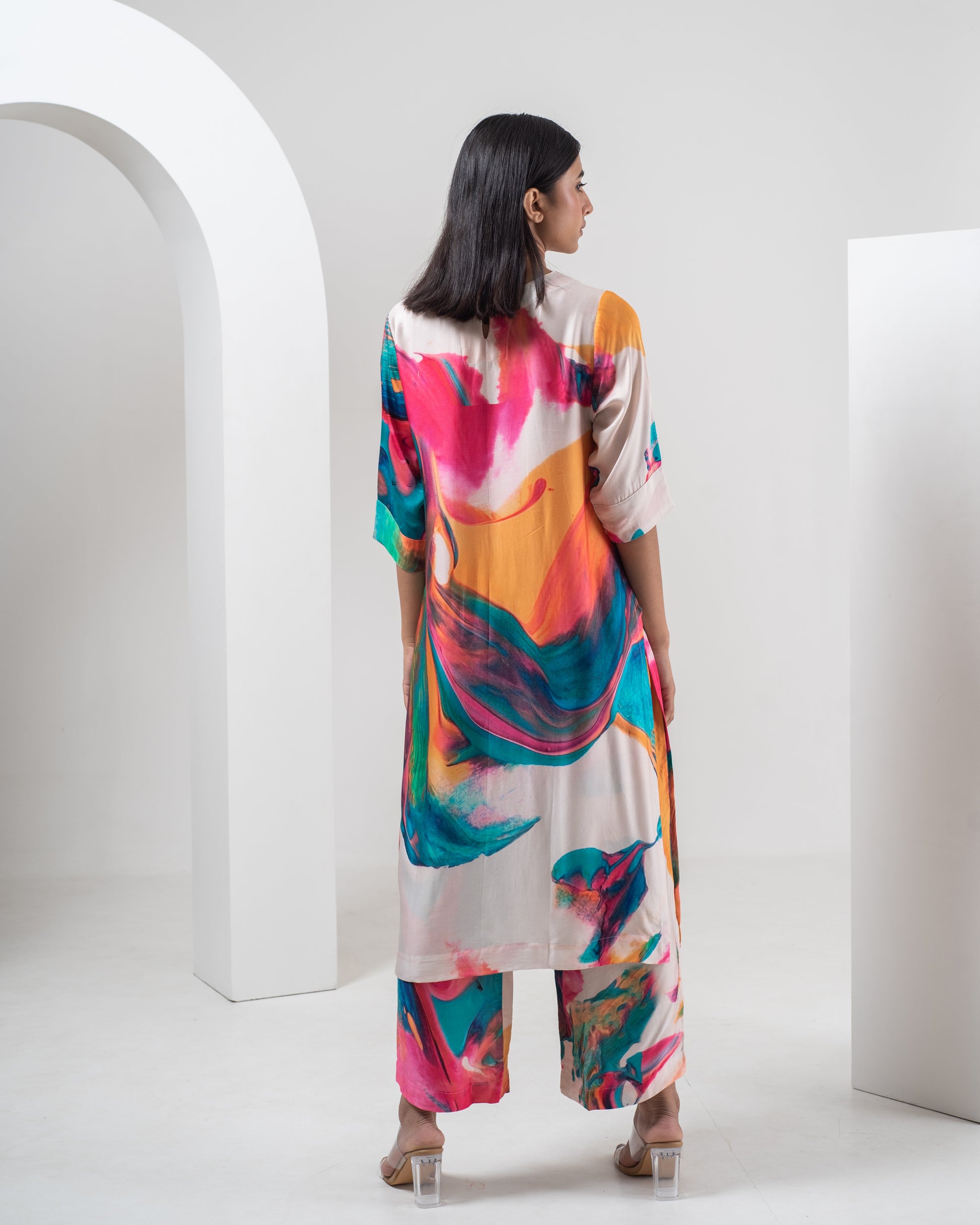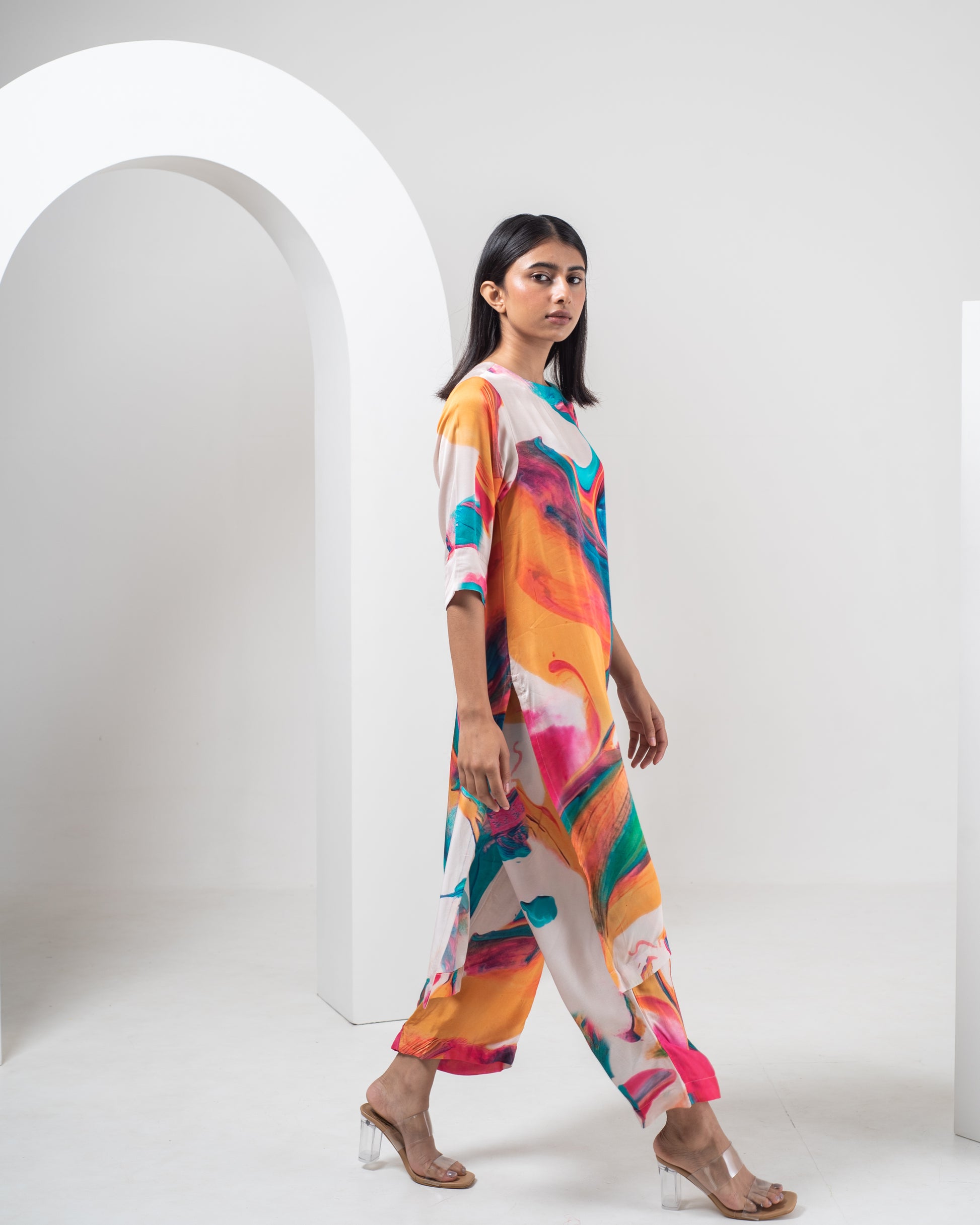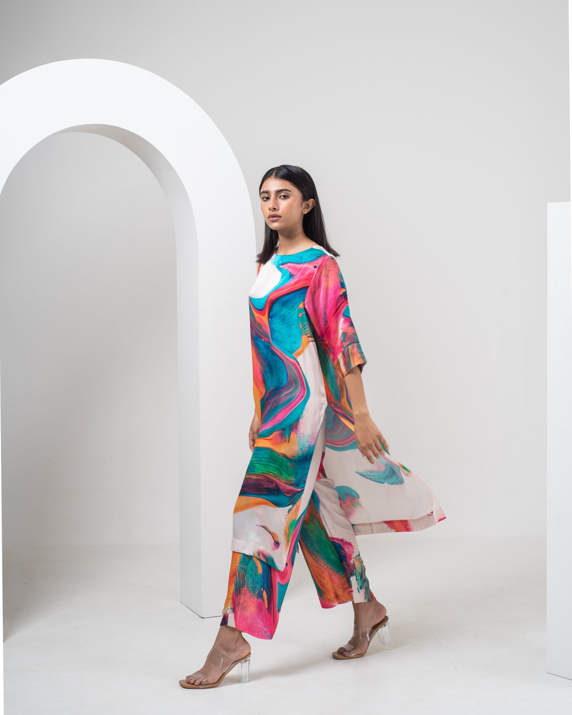 Embrace the essence of luxury with our Marbella Tunic Pant Set. Featuring a modern and vibrant splash of colour print, this set is handcrafted from sustainable plant-based silk for a luxurious feel. Truly unique and exclusive, this co-ord make a statement that is both elegant and environmentally conscious. This versatile piece is a must-have for anyone looking to add a pop of color to their wardrobe.