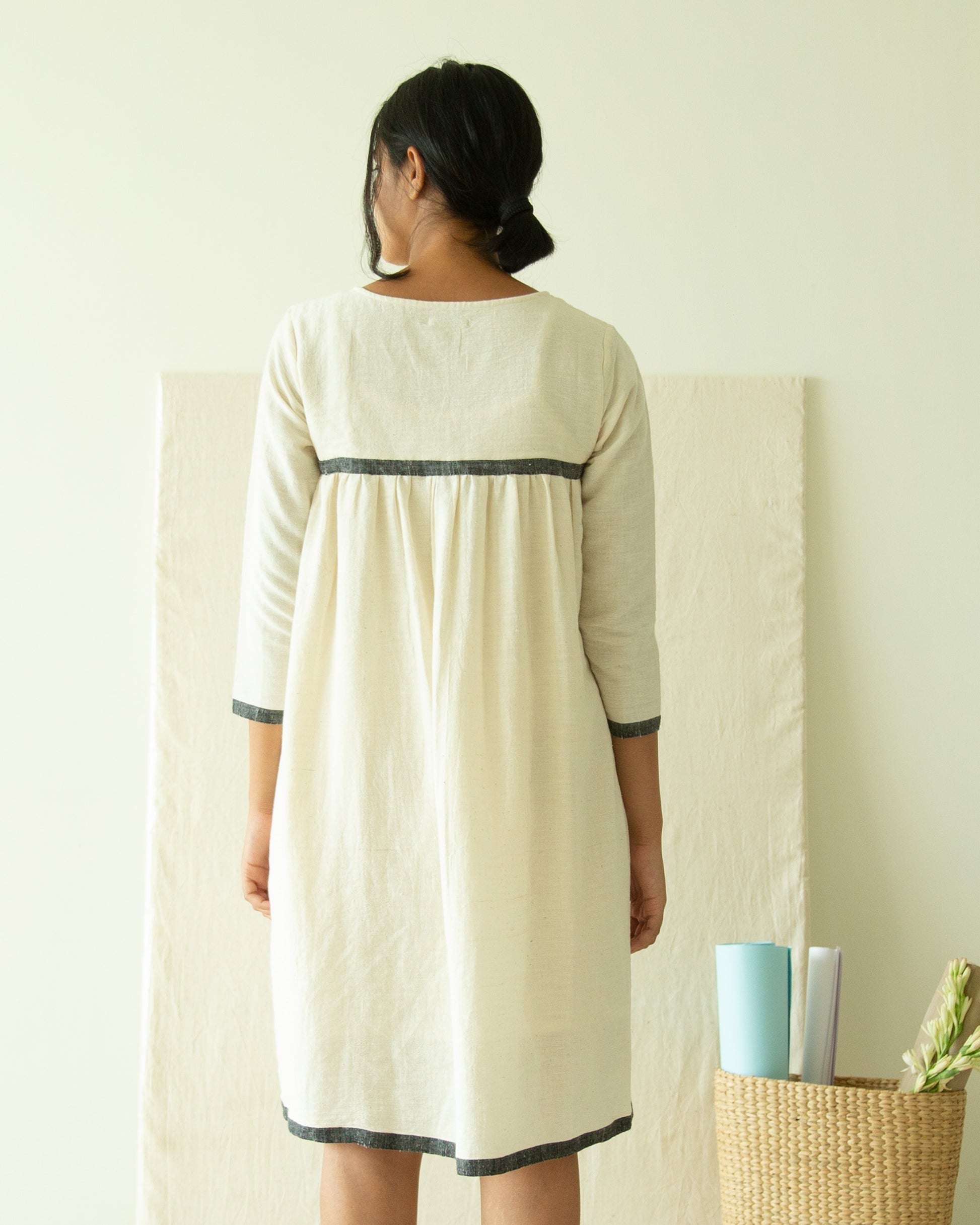 Presenting the Ivory dress in Organic Cotton fabric. It is handcrafted in handloom cotton with black selvedge.