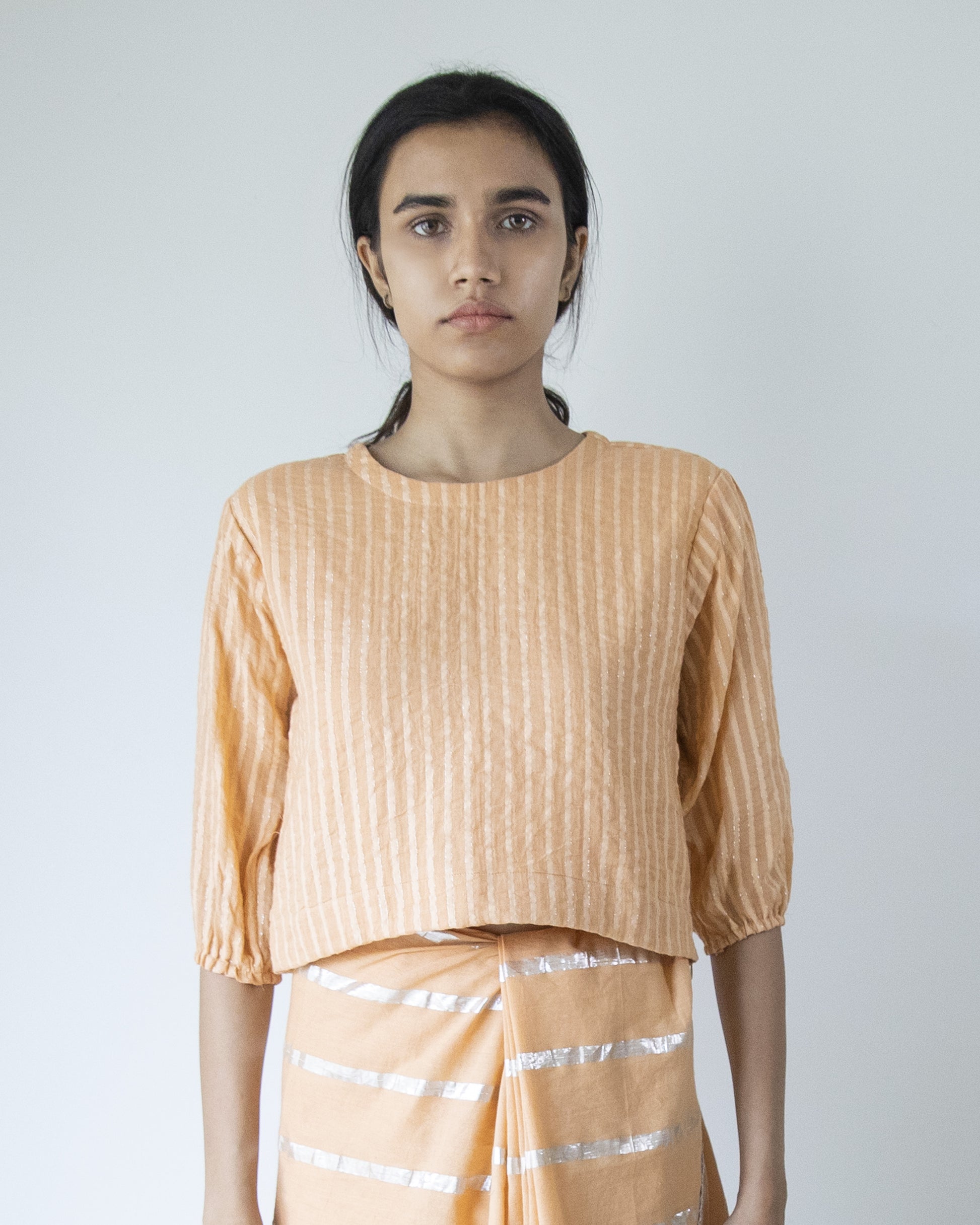 Featuring the Melon colour blouse in pure cotton woven fabric, with zari stripes. It comes with elasticated sleeve detail and side zip closure.